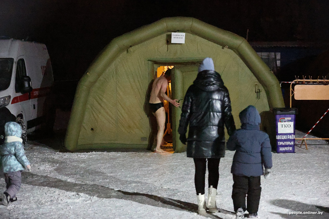 Мужчины переодевались в надувной раздевалке, потом трусцой подбегали к купели, напоминающей бак с водой, быстренько окунались, крестились перед иконой и шли греться в баню. На обратном пути мы остановили парня в плавках с надписью Boss. Им оказался блогер портала Slivki.by Вадим Витковский.