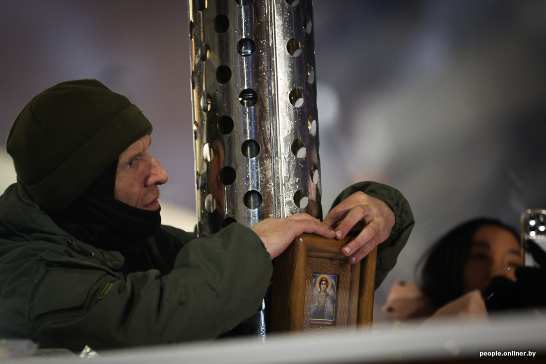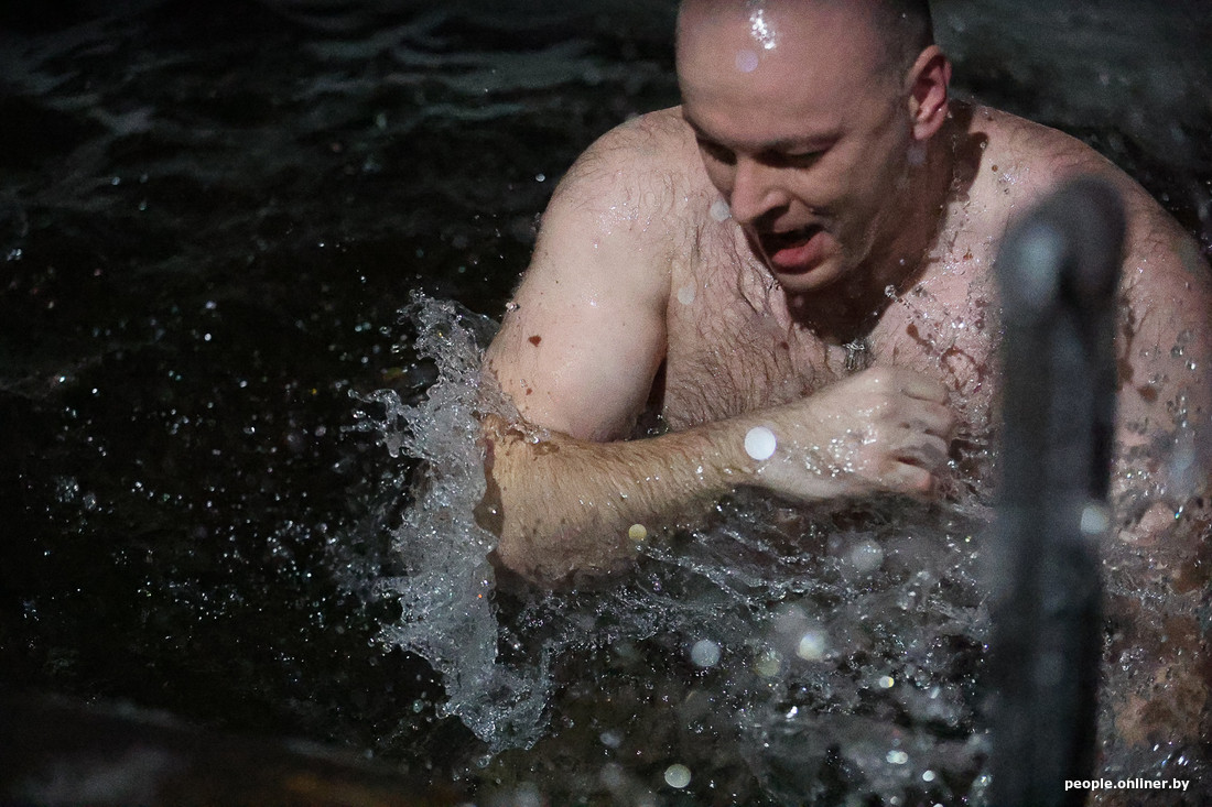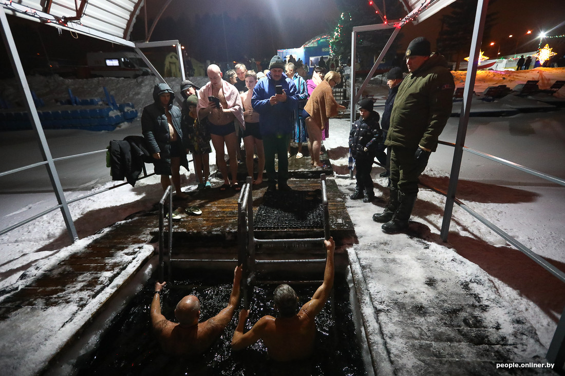 Больше всех в этот день нас с фотографом поразил минчанин Сергей. Сначала в купели побывали двое его сыновей (причем он уверял, что исключительно по их собственному желанию), а затем и сам спустился в прорубь. Наверх он не поднимался около семи минут, чем удивил присутствующих.