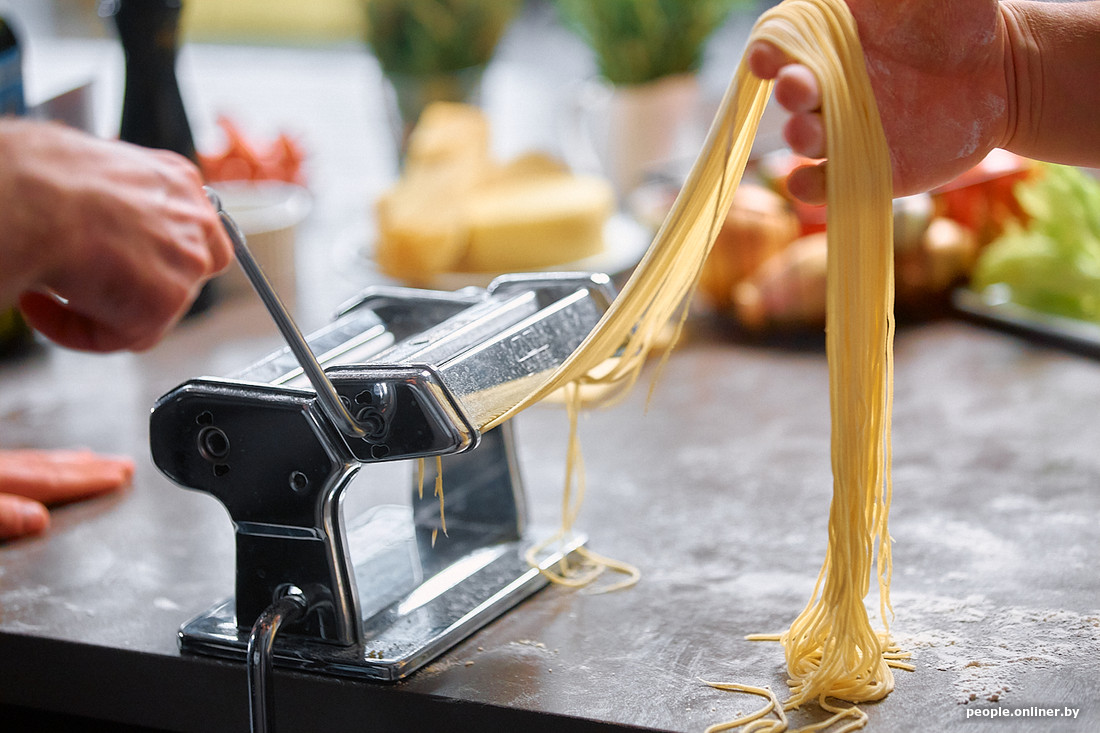 То же касается и нарезки самой пасты: один человек направляет тесто и крутит ручку, второй — на «приемке» готовых макаронин. Но если машинки нет, игра в итальянских домохозяек с раскаткой скалкой и нарезкой обычным ножом может получиться еще увлекательнее.