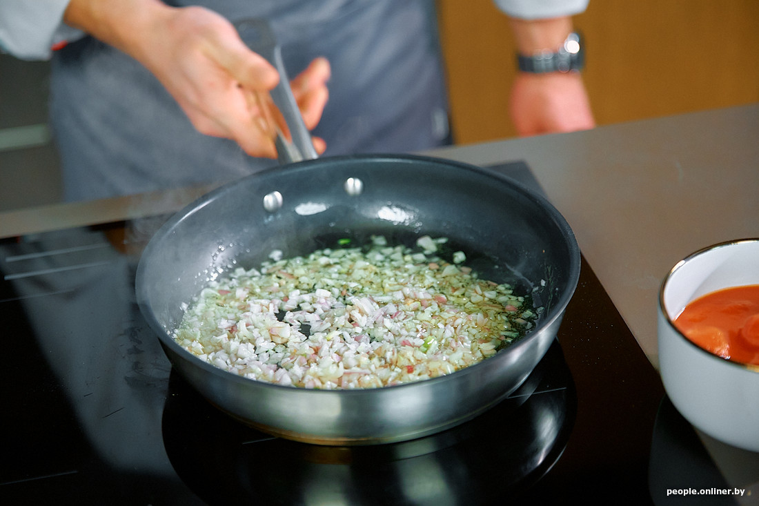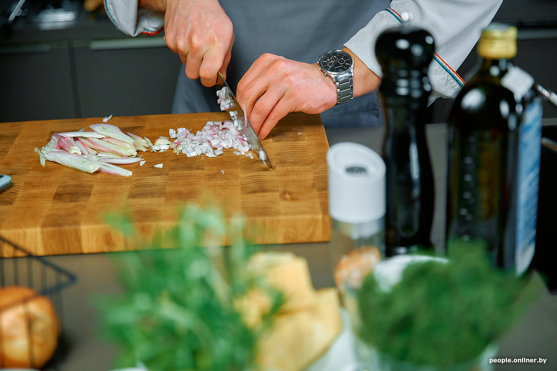 — Ставь руку так, чтобы нижние костяшки выпирали, а теперь будто чеши их боковой стороной ножа, не отрывая кончик лезвия от доски, — это Дима направляет мои корявые попытки делать вот это их «шик-шик-шик» ножом. — Большим пальцем двигай луковицу. И не спеши, скорость иногда тоже вредит… Что, все, минус палец? Давай его уже туда целиком, чтобы не мешал (смеется. — Прим. Onlíner)!