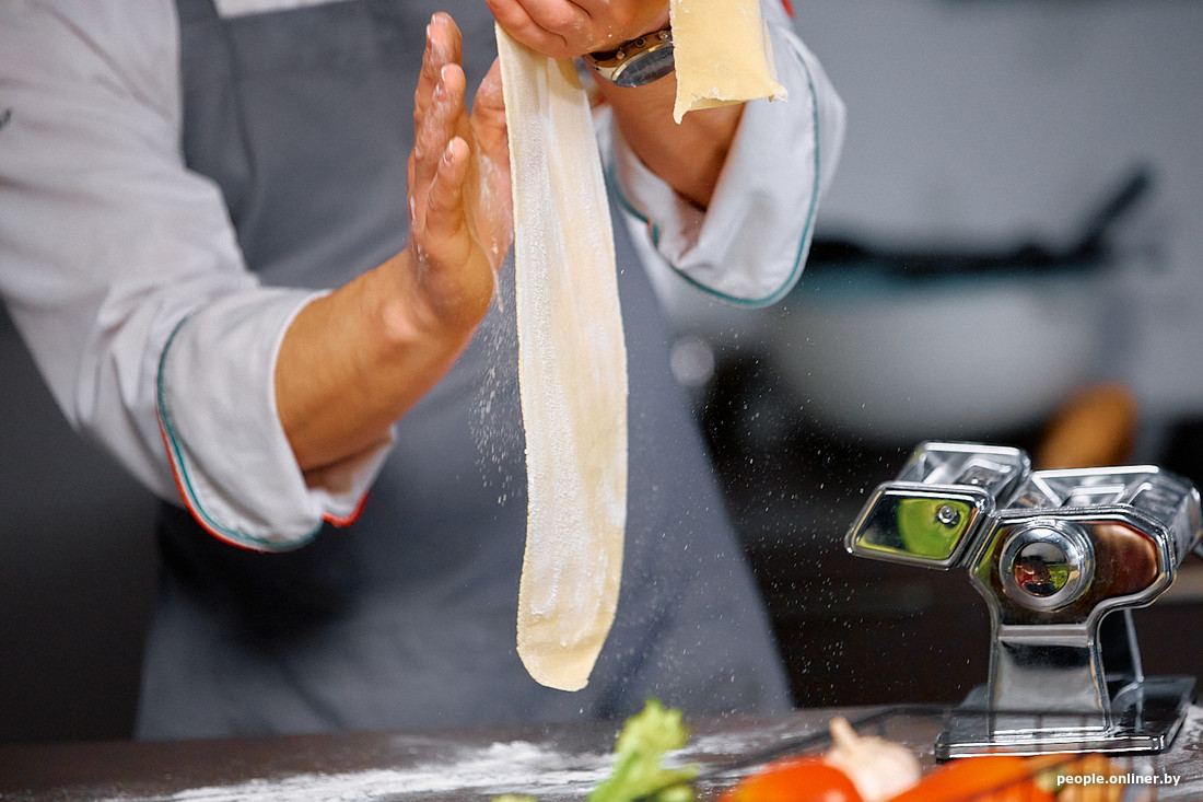Раскатка теста — чистая bellezza, здесь даже описаний особо не нужно. Раскатываем мы с помощью специальной чудо-машинки, что можно засчитать за читерский ход. Но зато если у вас такая найдется дома и вы не планируете ужин-сюрприз, то заготовка основы для пасты может стать прекрасным интерактивом для двоих. Полоска теста с каждой секундой становится все длиннее и тоньше — командная работа в четыре руки будет как нельзя кстати.