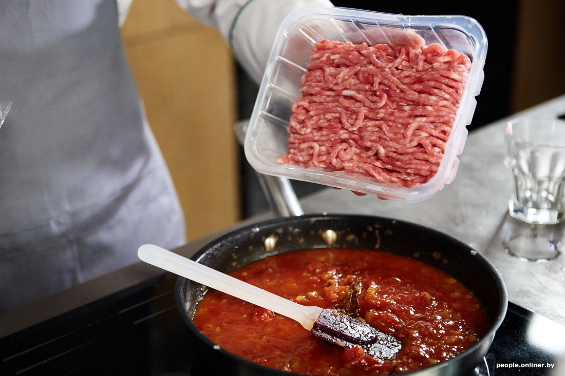Sua Maestà (Его Величество) — фарш, который мы закидываем к томатам, сельдерею и луку, разминая лопаткой. Фотограф-гурман Максим подкидывает лайфхак: мясо лучше предварительно слегка обжарить на отдельной сковородке — так, мол, будет сочнее. Дима в ответ пожимает плечами и говорит, что предварительная обжарка тоже имеет место и даже считается классикой — но сегодня мы готовим слегка авторский вариант. Воображение, нарисовавшее дополнительную грязную посуду в раковине, намекнуло, что лучше согласиться с шефом. Прости, Макс.