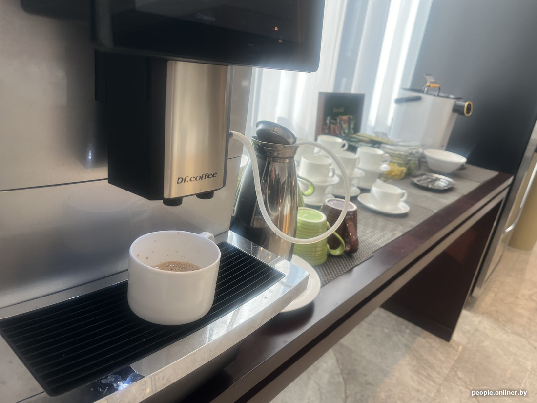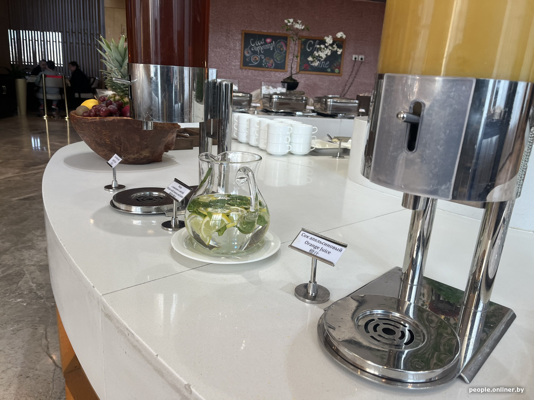Ну а теперь к напиткам. Кофе и чай здесь найти легко: большие автоматы стоят у окна. На столе неподалеку — бутылки воды, а рядом еще и холодильник с ними же. Информации о каких-то дополнительных оплатах нет, так что рискуем предположить, что все включено в те самые 80+ рублей. Соков насчитываем два вида, а еще стоит кувшин с водой, лимоном и мятой. Ловите подсказку: чуть в стороне можно заметить большую соковыжималку, которая делает апельсиновый фреш. А рядом на огромном блюде, полном льда, бутылка игристого. И да, оно тоже включено в счет, что приятно удивляет.