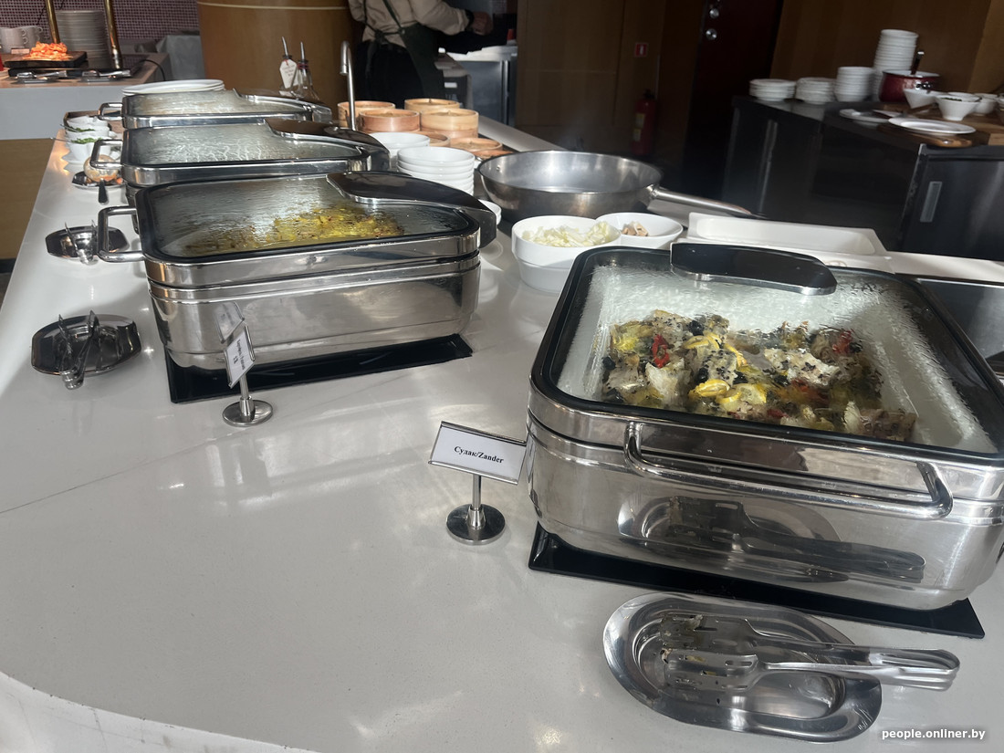 На очереди центр и завтрака, и зала — повар, которая готовит китайскую еду прямо на наших глазах. Круассаны и парма — хорошо, но лапша и крепкий горячий бульон — это то, ради чего мы сюда пришли. Повар рассказывает, что выбрать лапшу можно из трех видов, и на слух интереснее всего звучит та, что из батата. Мысль, что из сладкой картошки можно сделать лапшу, пытается как-то устроиться в голове, пока просим сделать блюдо со всеми возможными добавками. Порцию нужно немного подождать: перед нами схожий заказ сделали две девушки-китаянки. Если же китайская еда вам не близка, то тут же за столом можно взять картошку и, например, судака — тоже вполне себе достойная компания на завтрак.