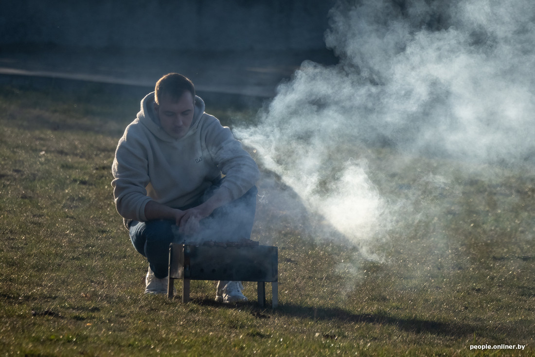 Людей на пляжах очень много, почти все парковки забиты. На Цнянке ГАИ даже ограничила проезд на стоянку. Купающихся не было. Шашлыки, игры, прогулки, кругом радостные жители столицы, которые соскучились по теплу.