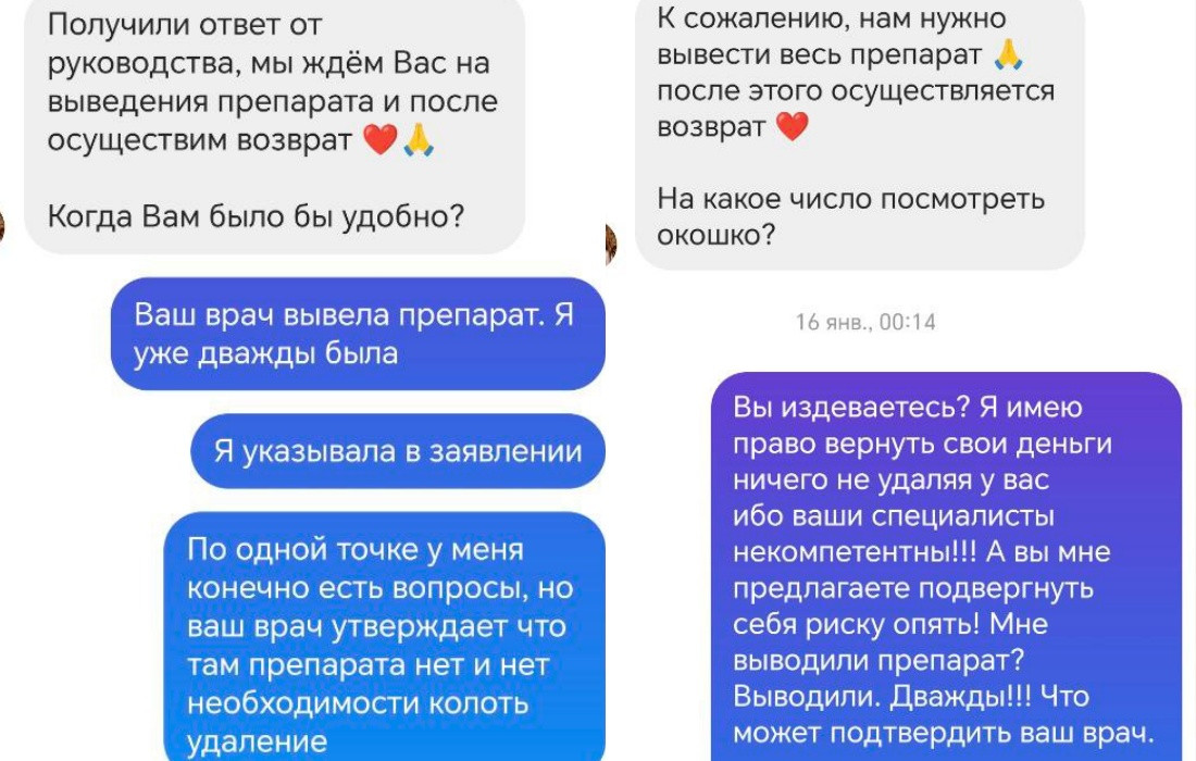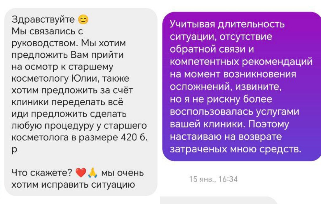 Женщина говорит, ее отправляли от одного косметолога к другому, снова и снова назначали консультации, но деньги возвращать отказывались. Предлагали переделать все у старшего косметолога или выполнить другую процедуру на выбор. Однако Елена стояла на своем: рисковать снова в том же салоне она была не готова.