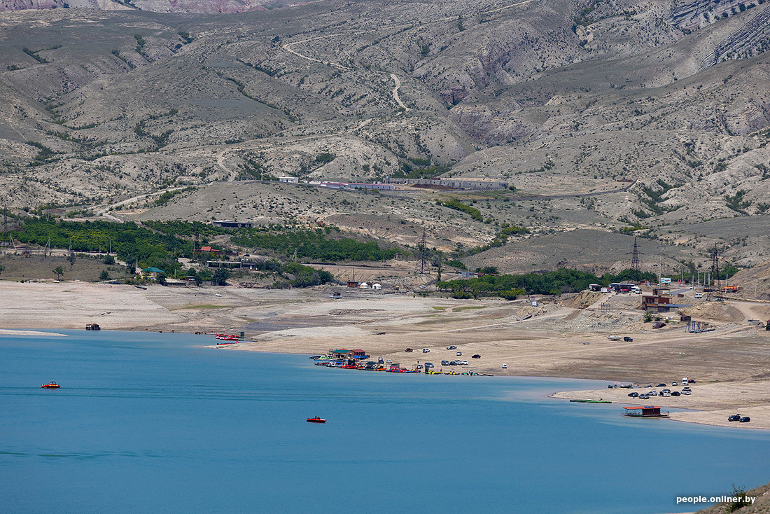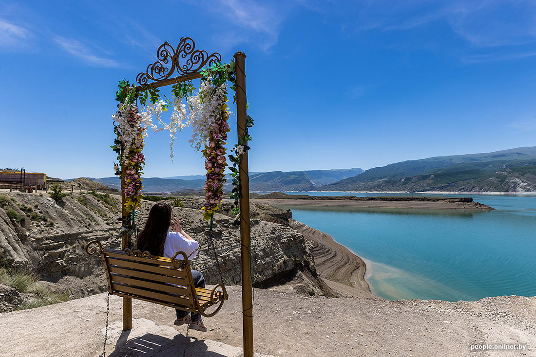 По дороге к каньону заезжаем на смотровую площадку у Чиркейского водохранилища. Здесь цвет воды уходит в насыщенную лазурь. Чтобы подчеркнуть романтичность ситуации, на площадке установлены качели, увитые искусственными цветами. Рядом виднеются остатки объявления, что удовольствие платное, — и напрочь игнорируются.