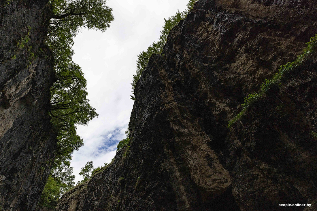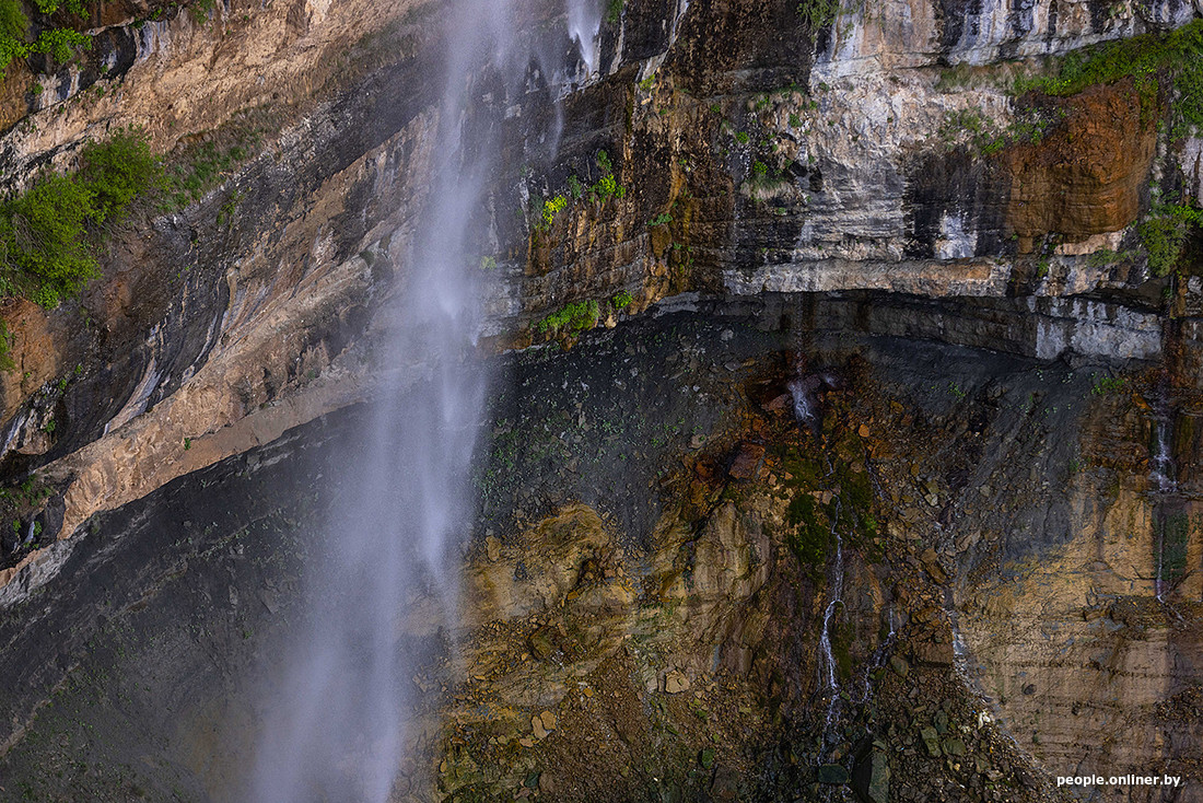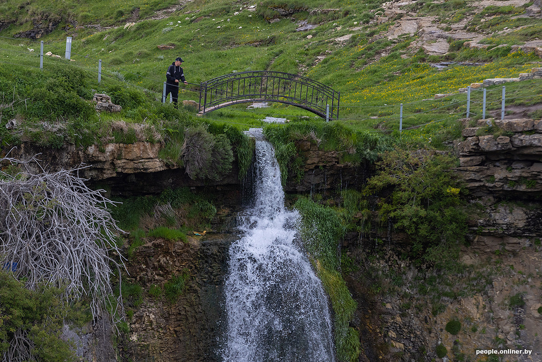 А потом ты видишь его — единственный в Дагестане подземный водопад. Вода падает с высоты 20 метров из почти идеально круглого отверстия в скале. При желании до природной достопримечательности можно дотронуться: к водопаду есть несколько подходов на разных уровнях. А вот купальщиков в июне мы не заметили.