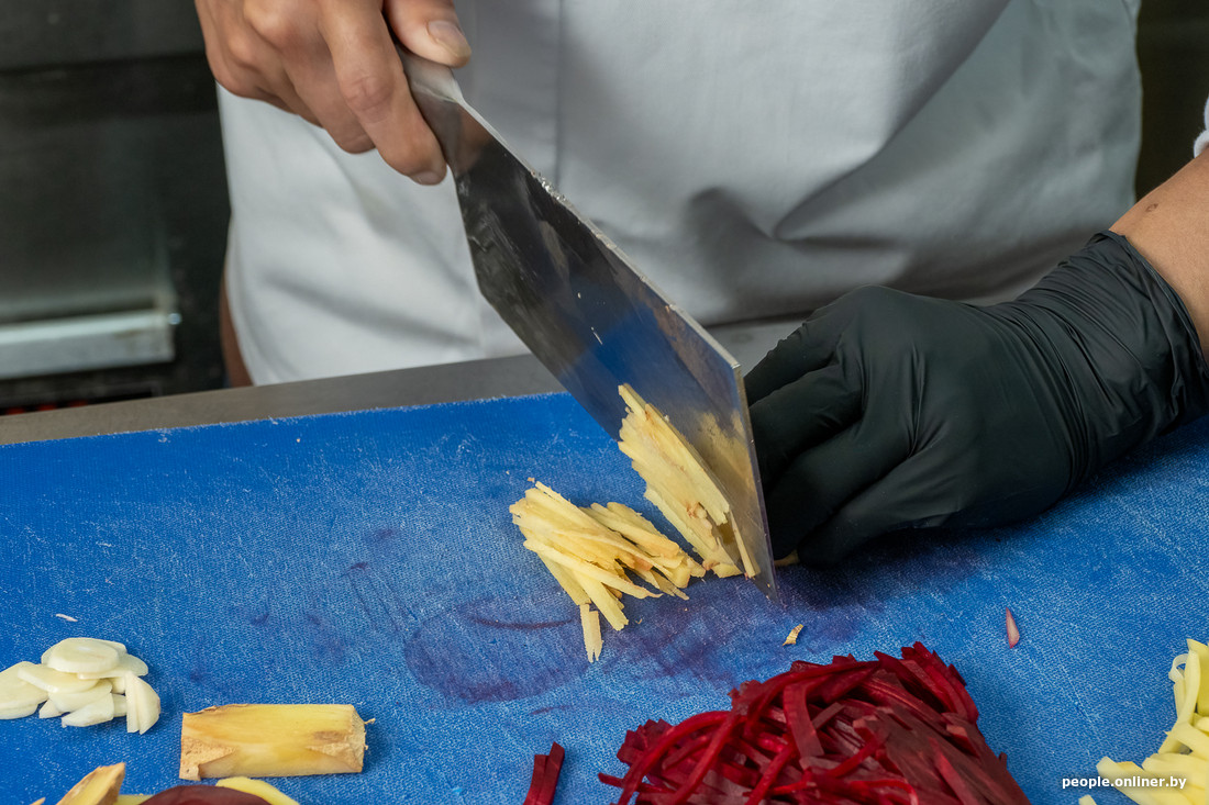 Тем временем Фан приступает к свекле. Шеф нарезает ее соломкой вместе с сырым картофелем, затем быстро обжаривает на растительном масле имбирь и чеснок.