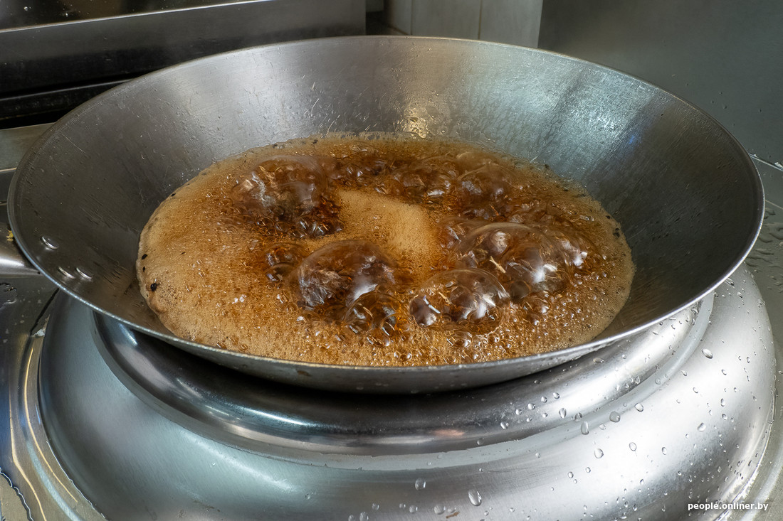 Все это присыпается уже знакомыми нам глутаматом и куриным порошком, а дальше заправляется перечным маслом. Субстанция довольно специфическая и по запаху напоминающая моющее средство для посуды с ароматом лимона, но в плане вкуса на удивление идеально балансирующая между острым, кислым и сладким.