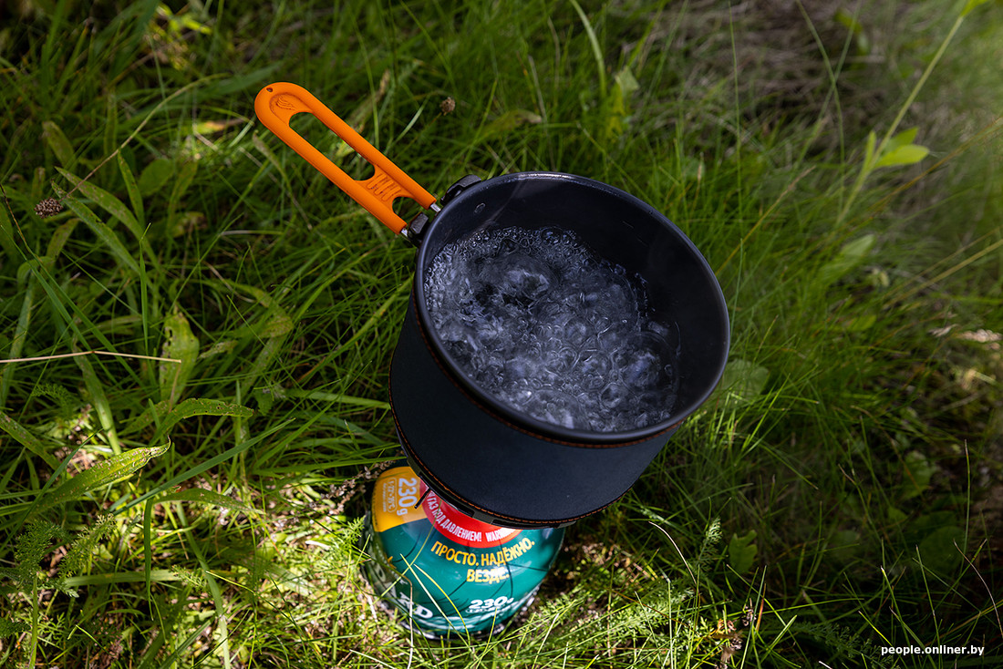 — Особенность современных газовых горелок — радиаторная система. Понятно, что газ в походе не бесконечен, его нужно экономить. На то, чтобы вскипятить воду, уходит 5 граммов газа. В этом баллоне — 230. А радиаторная система позволяет делать все быстрее и за счет этого тратить меньше газа.