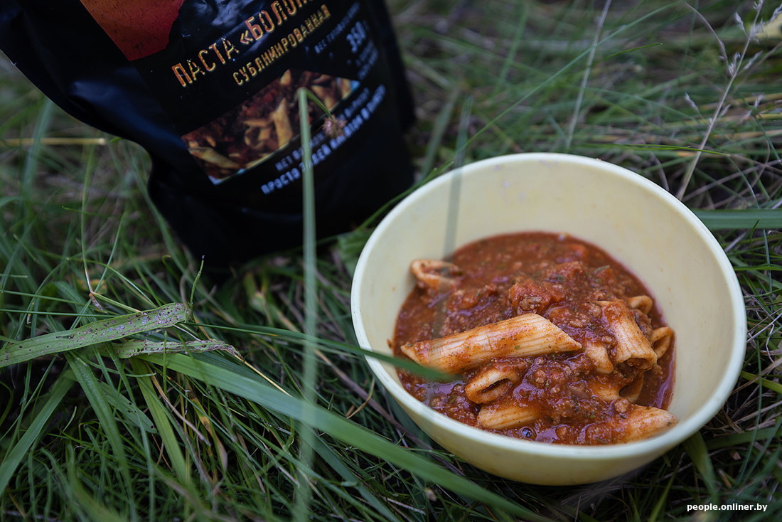 В теме питания наш разговор снова возвращается к уменьшению веса. Выходом может стать сублимированная еда. Например, полностью лишенная жидкости паста болоньезе весит всего 110 граммов, если залить ее 350 миллилитрами воды, получится порция на двоих. Список вариантов блюд большой — от индийской курицы карри и супа фо бо до сублимированных пельменей. Кстати, заваривать блюдо можно прямо в упаковке, а пока оно доготавливается, спрятать под мышку, чтобы погреться, делится лайфхаком Митя. Любое из таких блюд весит в разы меньше привычной тушенки с гречкой.