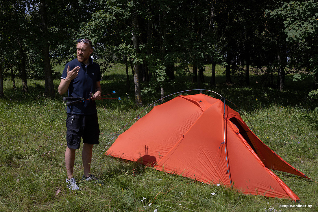 — Но не нужно их сравнивать. Вторая палатка исключительно для пешего туризма. В горы ее, конечно, можно взять — я с этой палаткой выполнял проект «Уральский барс» зимой. Но в основном ее используют летом и до среднегорья. Здесь абсолютно простая установка: мы положили наш тент, воткнули в землю четыре колышка — практически готово. За это, помимо веса, люди и любят эту модель.