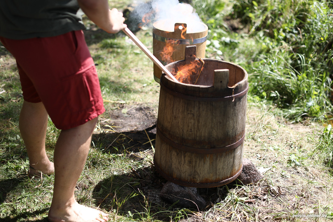 Трое мужиков закидывают раскаленные камни в бочку с помощью огромных деревянных щипцов. Не думаю, что стал бы свидетелем чего-то подобного в каких-либо еще обстоятельствах, кроме нашей пивной реконструкции. Хмель из Холопеничей по заветам оршанского хорунжия тоже отправился в кадку.