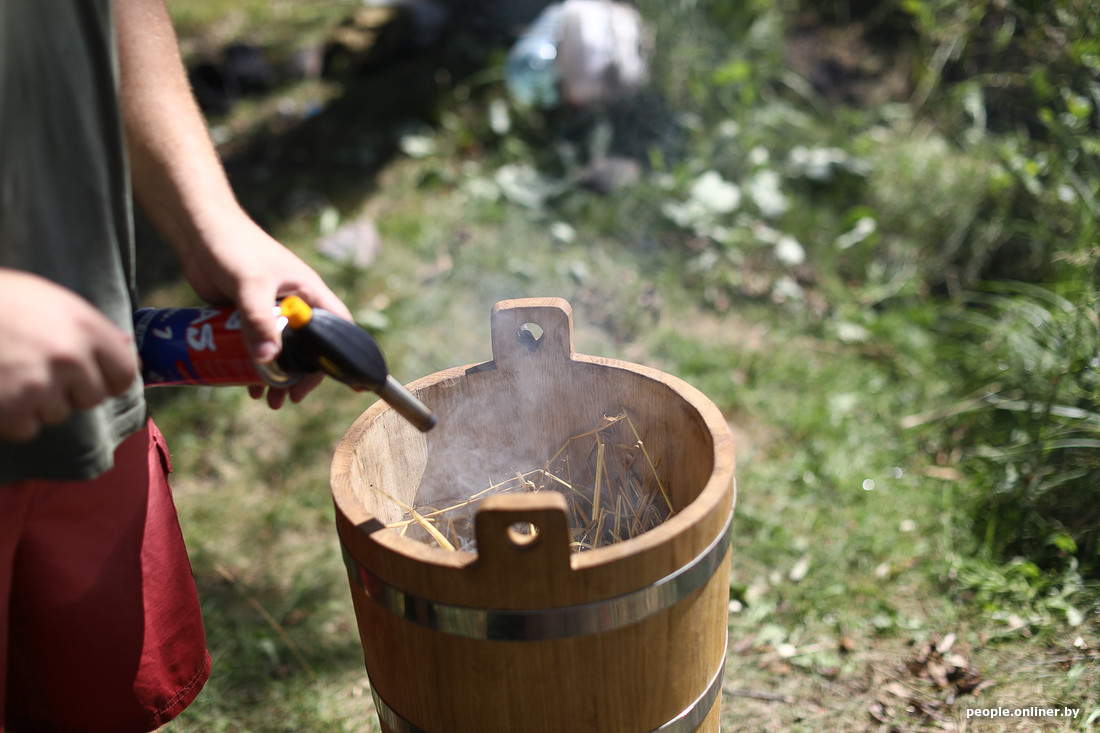 Обе кадки, которые будут принимать участие в варке, следуя древним записям, обеззараживаем: набиваем специально привезенной соломой и поджигаем. В воздух поднимается столб дыма, который наверняка заметен даже с противоположного берега.