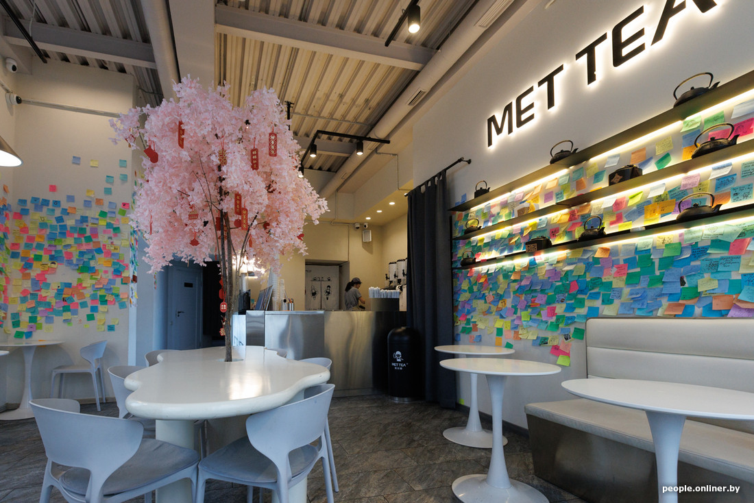 С Хаомином, владельцем минских кафе Met Tea, мы встречаемся в небольшом заведении на площади Свободы, 4. Прямо напротив входа расположена барная стойка, за которой бариста готовит напитки, справа — зал для посетителей. Его стены буквально заклеены стикерами с пожеланиями от посетителей на трех языках: русском, английском и китайском. Среди них встречаются милые послания вроде «Лиза, Катя. Вам обязательно нужно это попробовать. Мама и папа», «Удачи и любви моим детям. Мама!» или «Ищу мужа!».