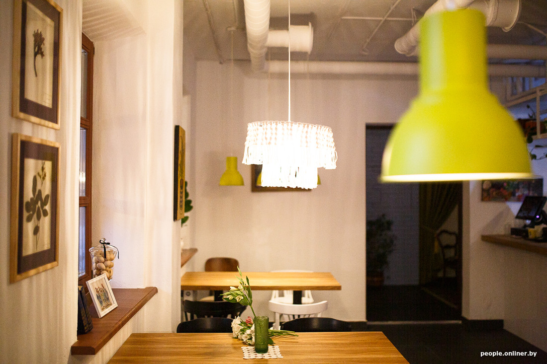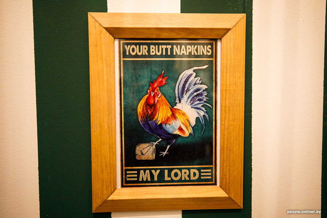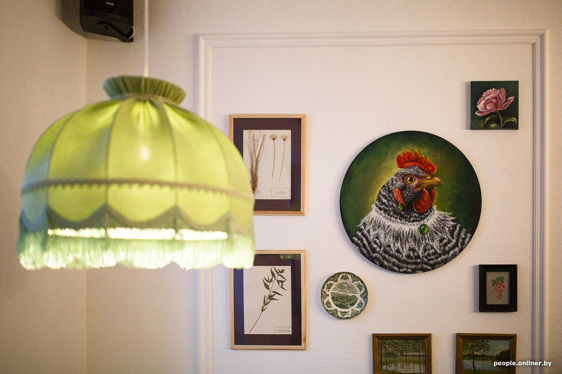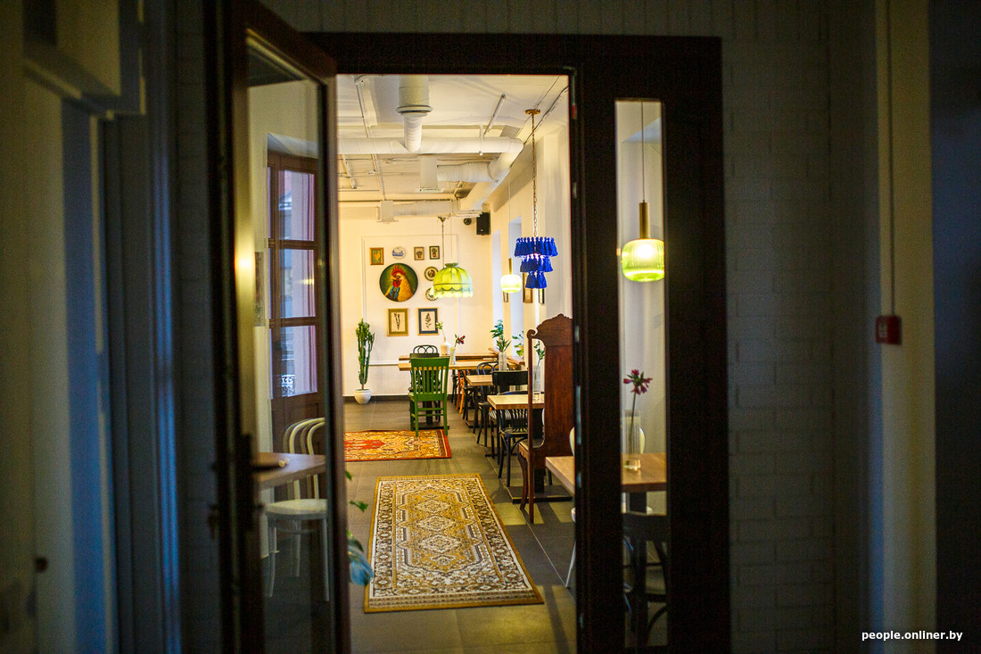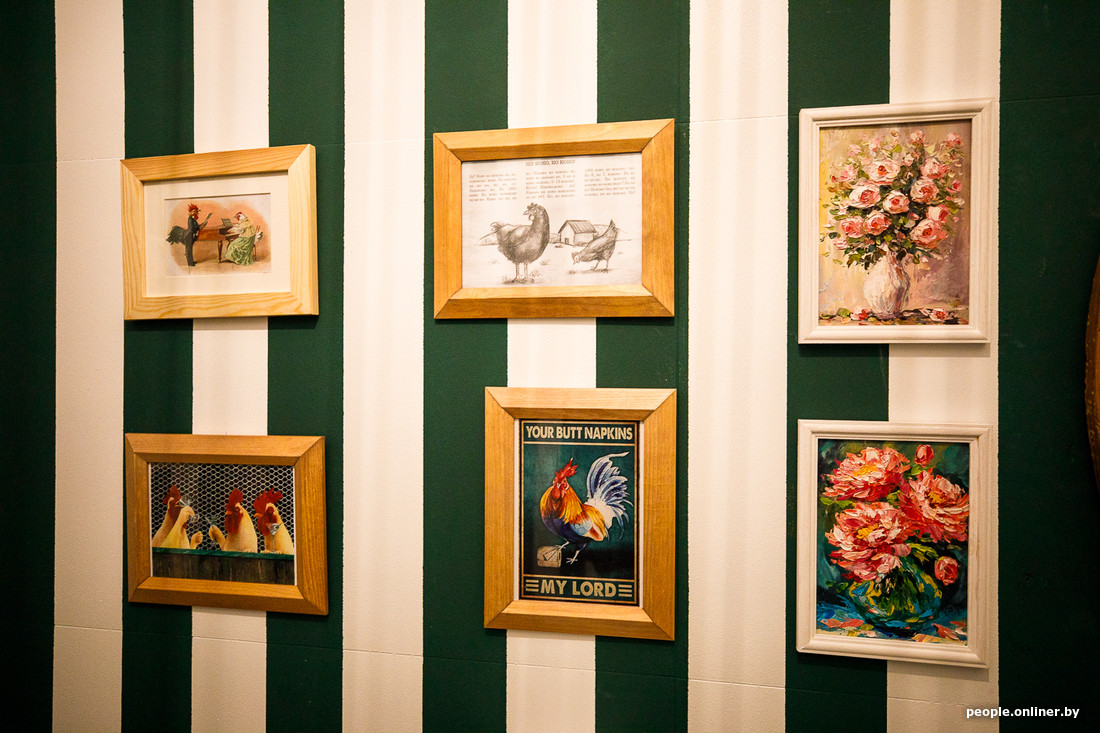 На стенах по всему ресторану развешены картины белорусских художников. Нам рассказывают, что художники сами присылают работы, а дальше дизайнеры решают, вписывается ли арт в концепцию. Кому-то даже отказывали: понятные пейзажи и куры — да, замудреная абстракция — мимо. Скоро на стены добавят QR-коды — и понравившуюся картину можно будет купить, связавшись с автором.