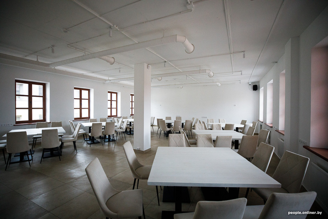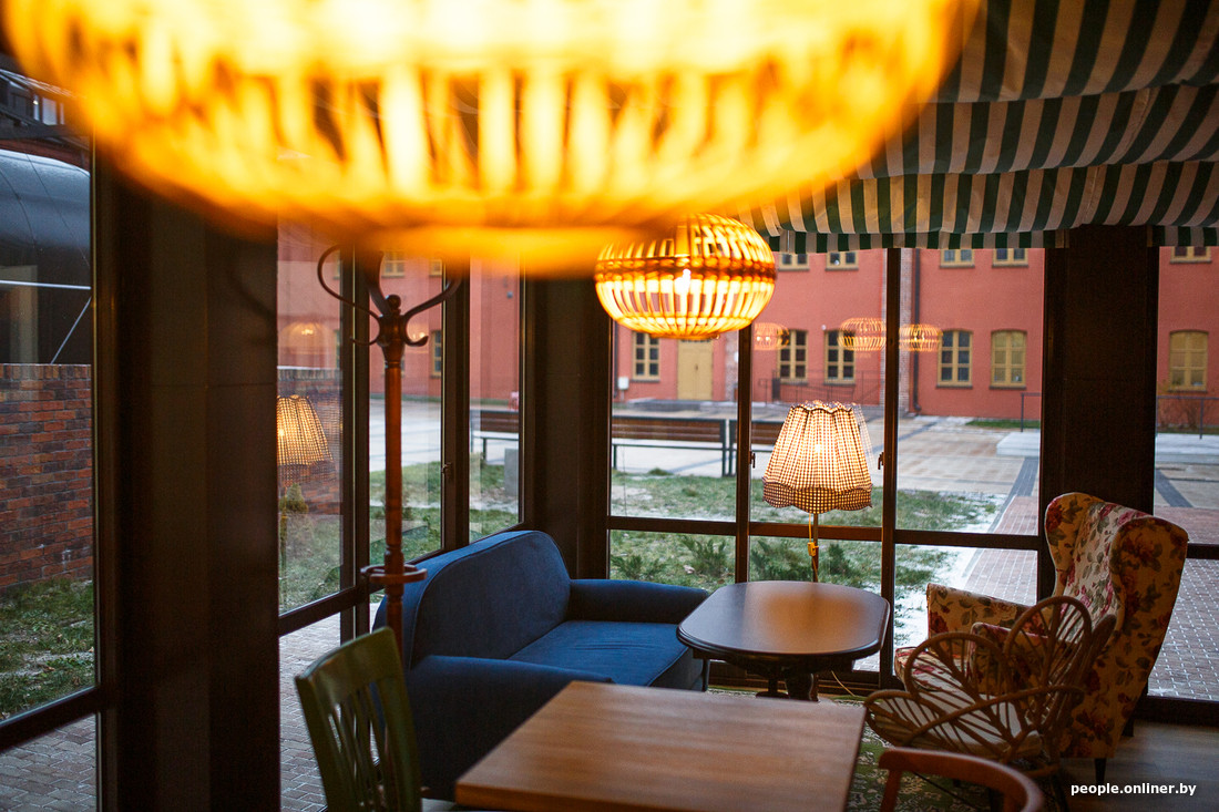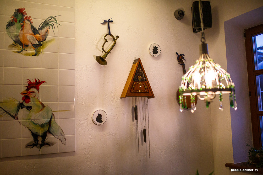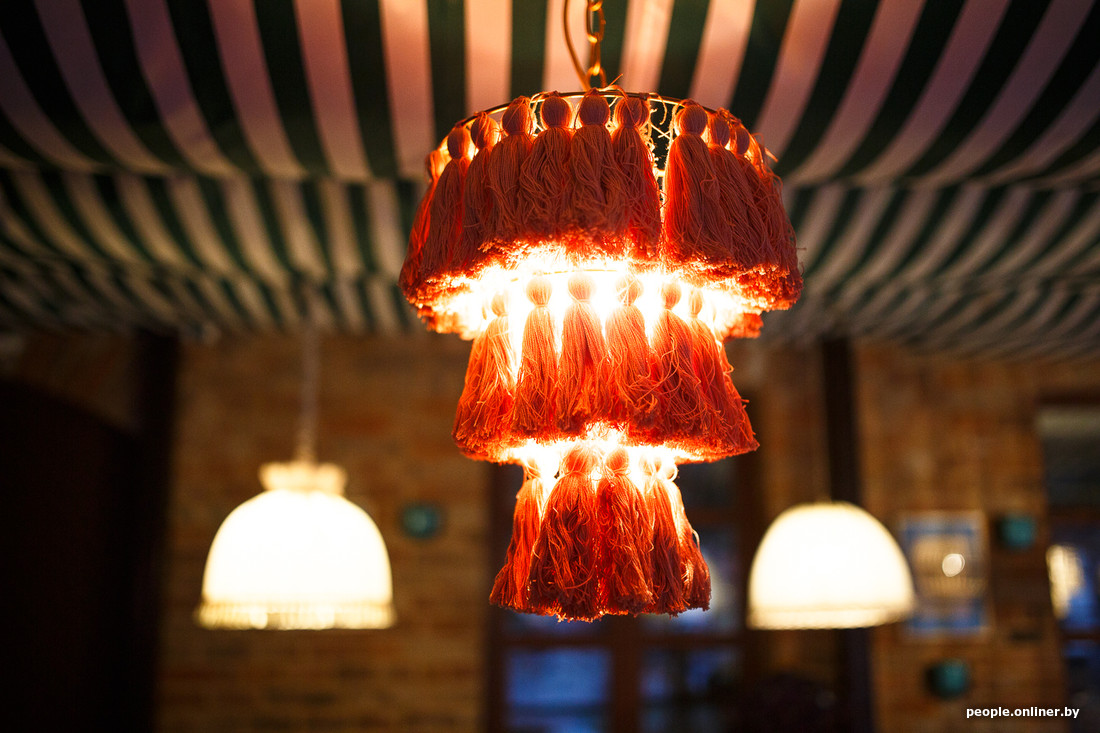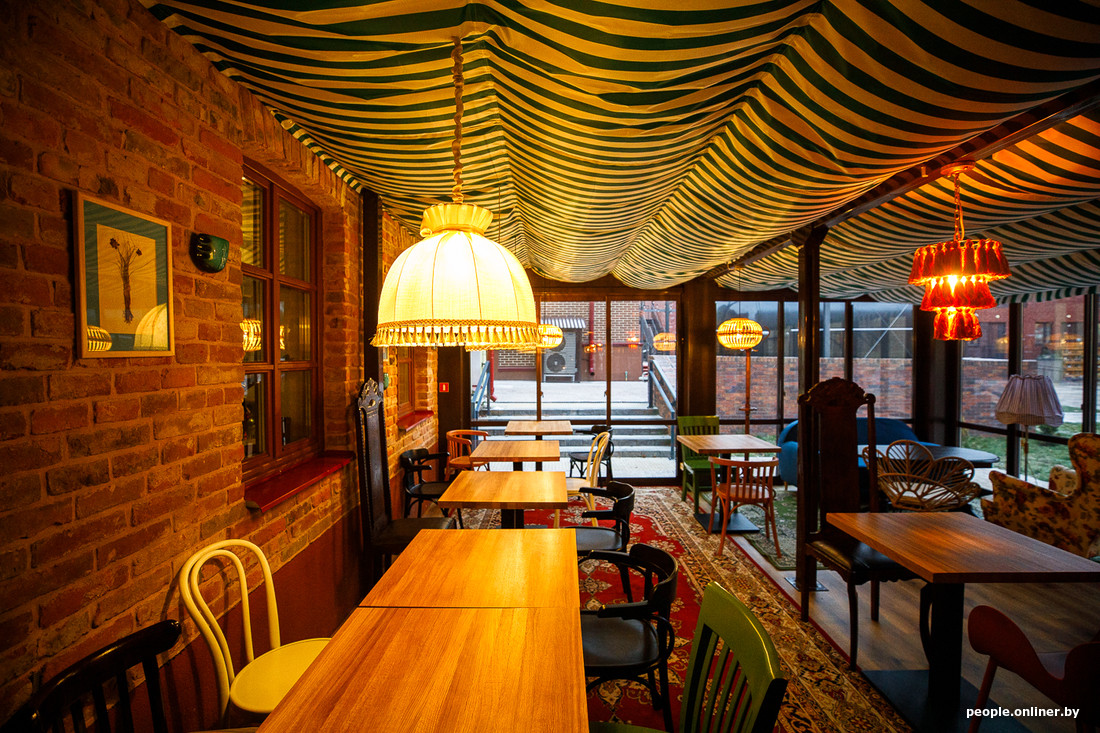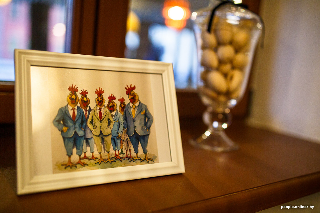 На стенах по всему ресторану развешены картины белорусских художников. Нам рассказывают, что художники сами присылают работы, а дальше дизайнеры решают, вписывается ли арт в концепцию. Кому-то даже отказывали: понятные пейзажи и куры — да, замудреная абстракция — мимо. Скоро на стены добавят QR-коды — и понравившуюся картину можно будет купить, связавшись с автором.