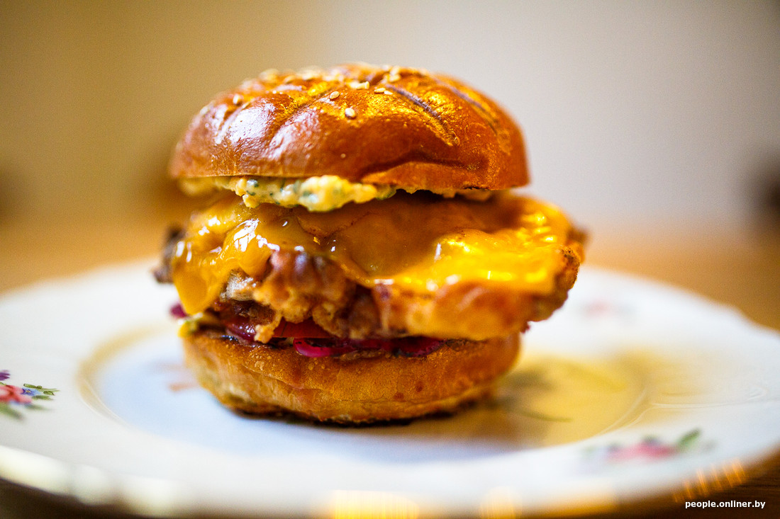 Ну и как же без бургеров? Тестируем. Внутри куриное бедро — мягко и сочно. К нему добавлен соус тар-тар — и с ним курица играет совсем иначе.