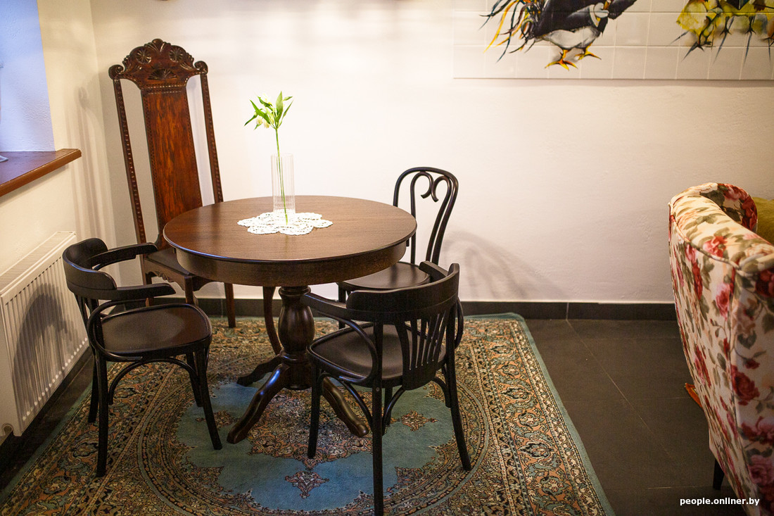 На первом этаже расположена барная стойка. Бегло общаемся с шеф-барменом о меню. Нам рассказывают, что в карте есть коктейльная классика, но по запросу гостя приготовить могут практически что угодно. Мы берем кофе, который подают в чашках а-ля бабушкин сервиз. Алексей рассказывает, что вся посуда в «Курином клубе» вдохновлена стилем ретро, но это не антиквариат в чистом виде. В любом случае все выглядит по-домашнему и добавляет уюта.