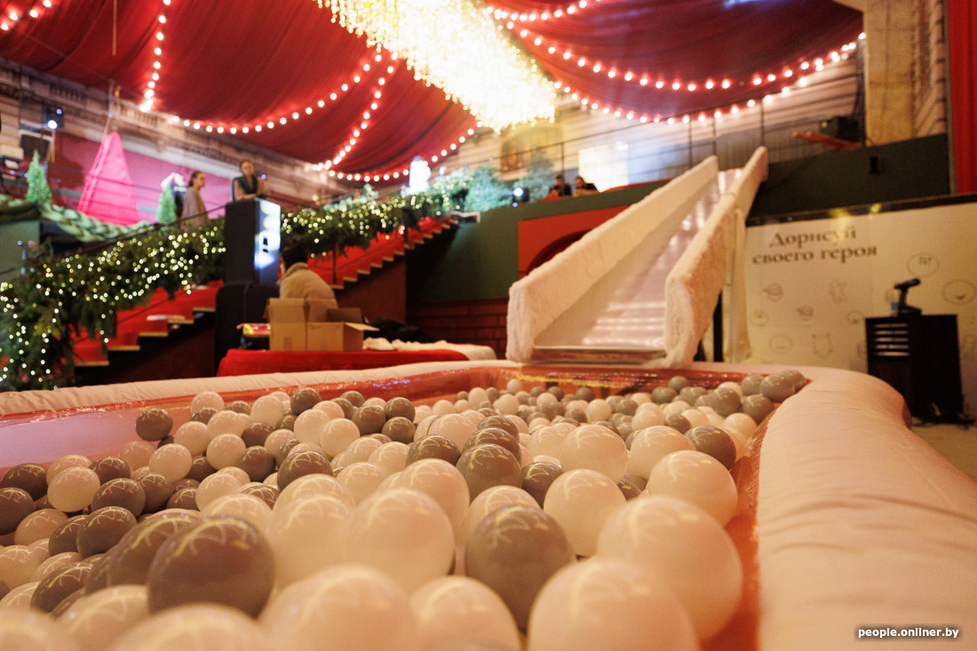 Все пространство разделено на зоны. Конечно, фото описывают обстановку лучше. Но можем вместе попробовать и пофантазировать. Например, здесь есть лес елок, которые могут украшать все гости. А еще зона «Мечтай», где абсолютно легально можно записывать свои мечты на стенах, полу или даже потолке. Но кажется, наибольший отклик вызывает развлечение, лишь отдаленно связанное с Новым годом, — 3,5-метровая горка, которая ведет в бассейн с шарами. Есть и экстрим — можно пролететь на тросе под потолком. Перечислять все развлечения не будем, чтобы не испортить эффект сюрприза.