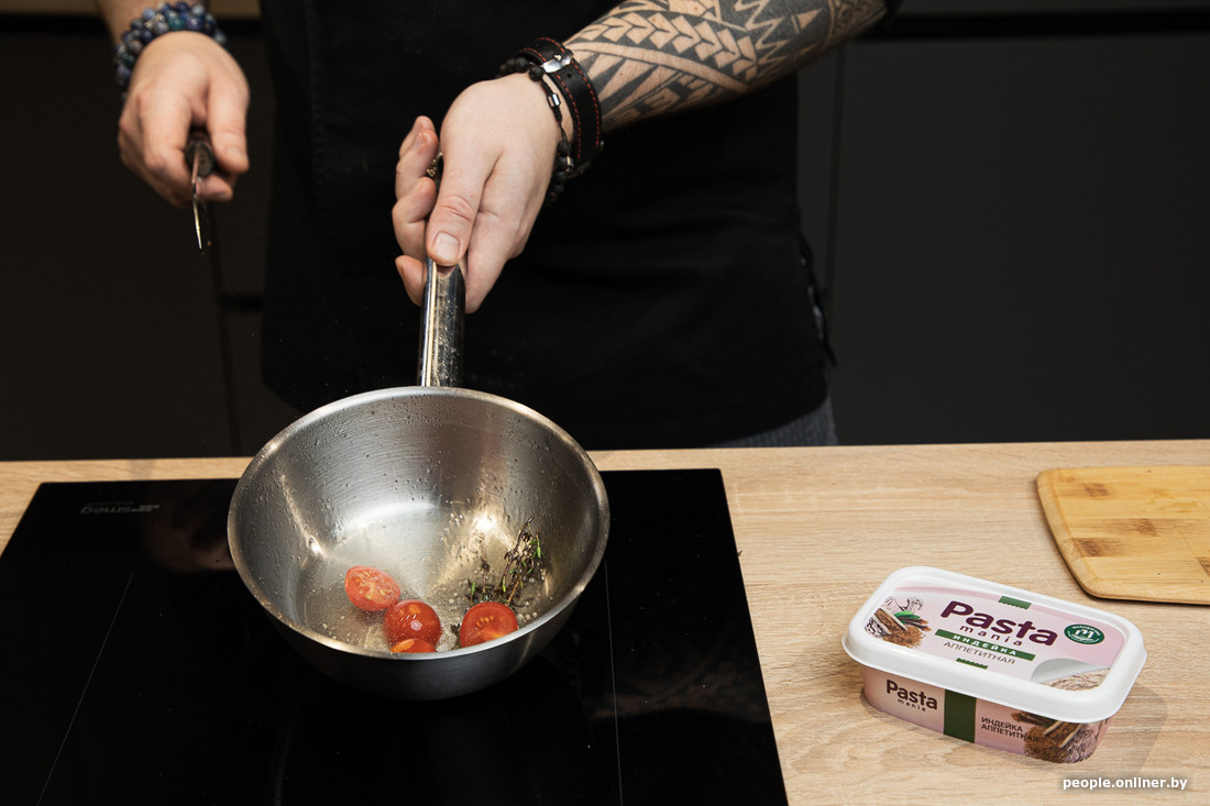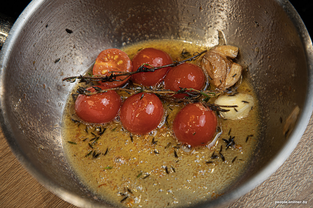 — Первым делом запечем наши томаты. На сковородку либо в сотейник добавляем масло. Туда же для аромата отправляем немного тимьяна и выдавленный зубчик чеснока, — рассказывает шеф. — Маленькие черри режем на две части, большие — на четыре. После этого бросаем их в кастрюлю и 1—2 минуты обжариваем, постоянно размешивая. Для вкуса можно добавить чайную ложку сливочного масла.