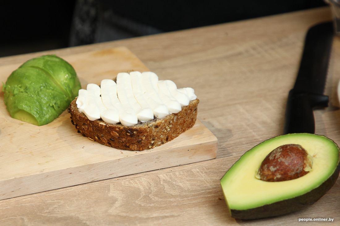 Для начала тонкими слайсами нарезаем авокадо и переходим к хлебу. В этом случае Максим советует его не поджаривать на сковородке, а потреблять в свежем виде. Не жалея творожной пасты, толстым слоем распределяем ее по нарезанной булке. Параллельно готовим яйцо всмятку, подержав сотейник на огне 4 минуты после закипания.
