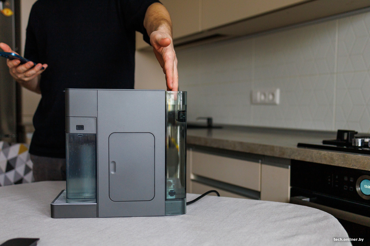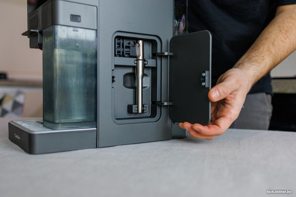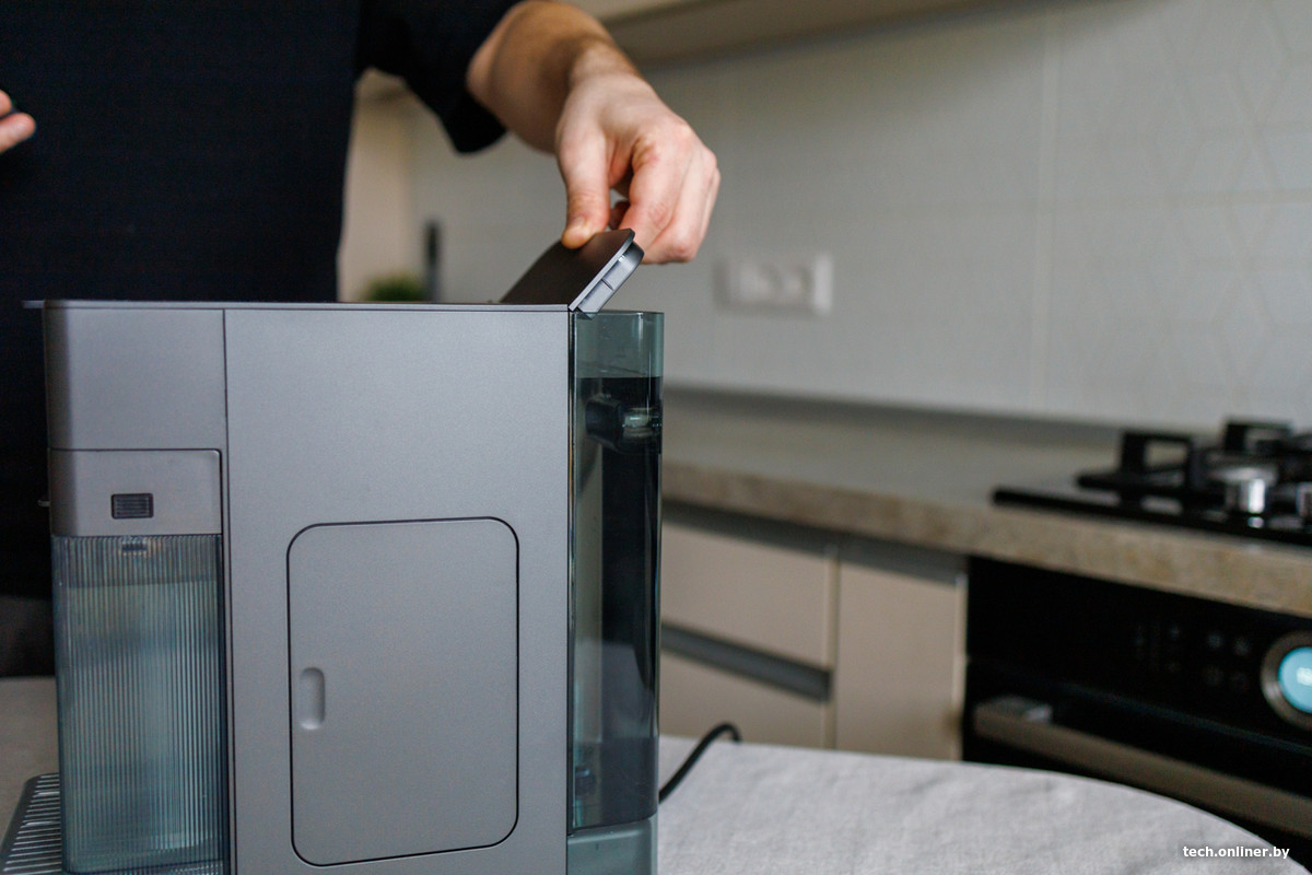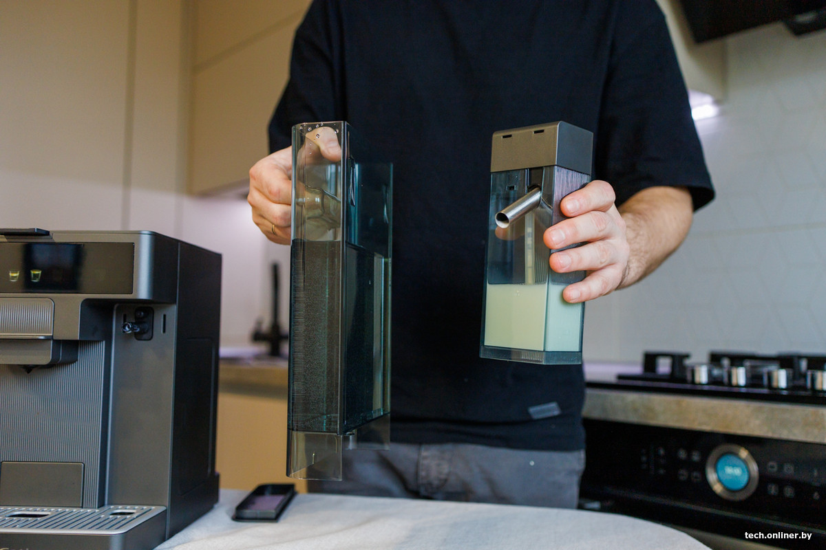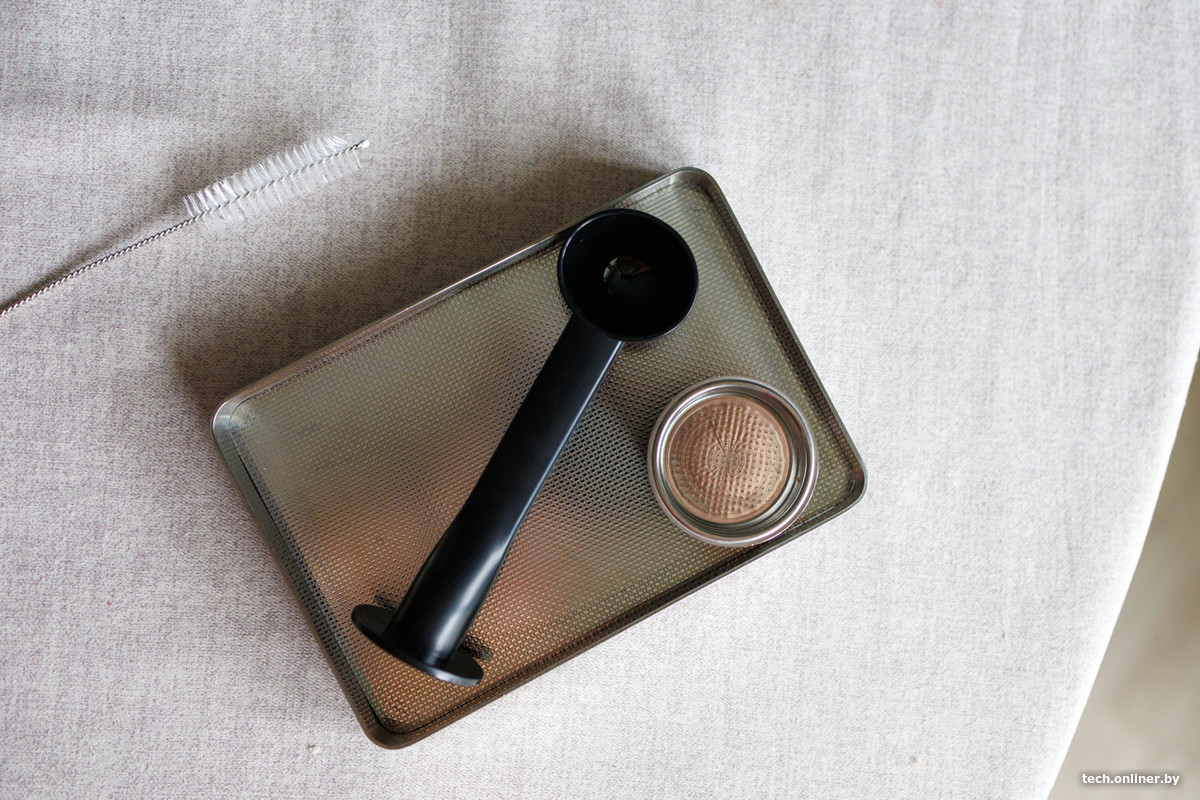 Перед первым использованием рекомендуется промыть емкости для молока и воды — и тут мы сталкиваемся с проблемой. Бак для воды очень узкий, и мужская рука туда попросту не пролезает. Для того чтобы хорошо его промыть, пришлось использовать узкую щетку с длинной ручкой. Пожалуй, объясняется это вертикальной компоновкой кофеварки для более компактных размеров.