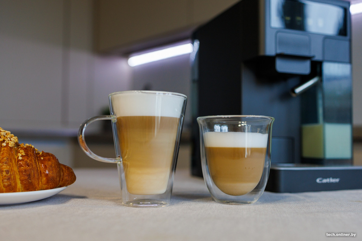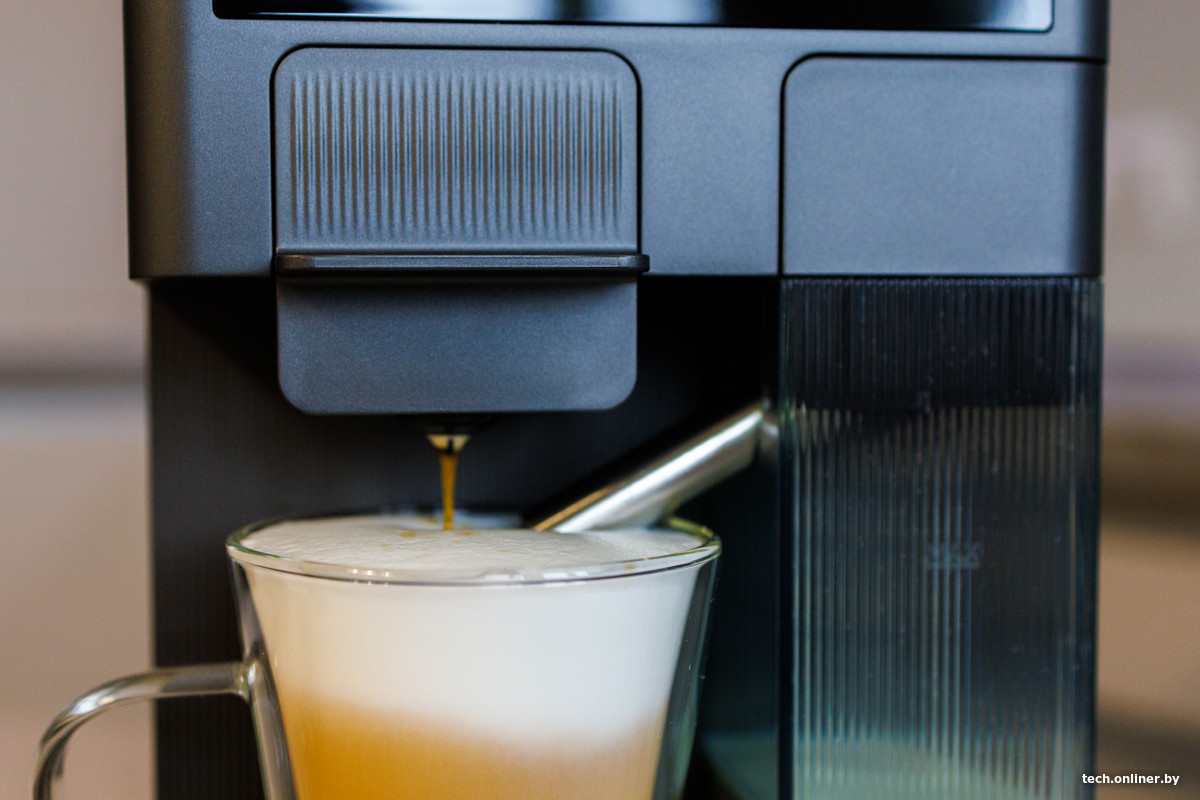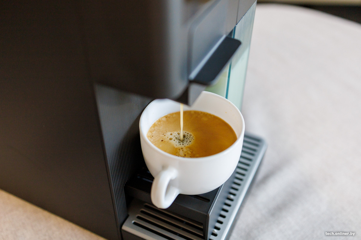 После того как кофеварка остыла, мы заменили капсулу и наполнили молочник до максимума для приготовления капучино и латте. Предварительный нагрев занял все те же 40 секунд. Для приготовления капучино понадобилось 75 секунд, а для латте — на 15 секунд больше. После чего в молочнике осталась примерно треть залитого молока. Сенсорные кнопки, к слову, опять удалось нажать не с первого раза. С точки зрения слоев капучино и латте получились достаточно похожими — основное отличие в их объеме и количестве молочной пенки.