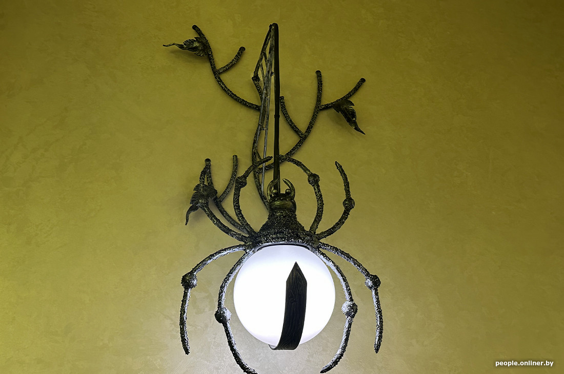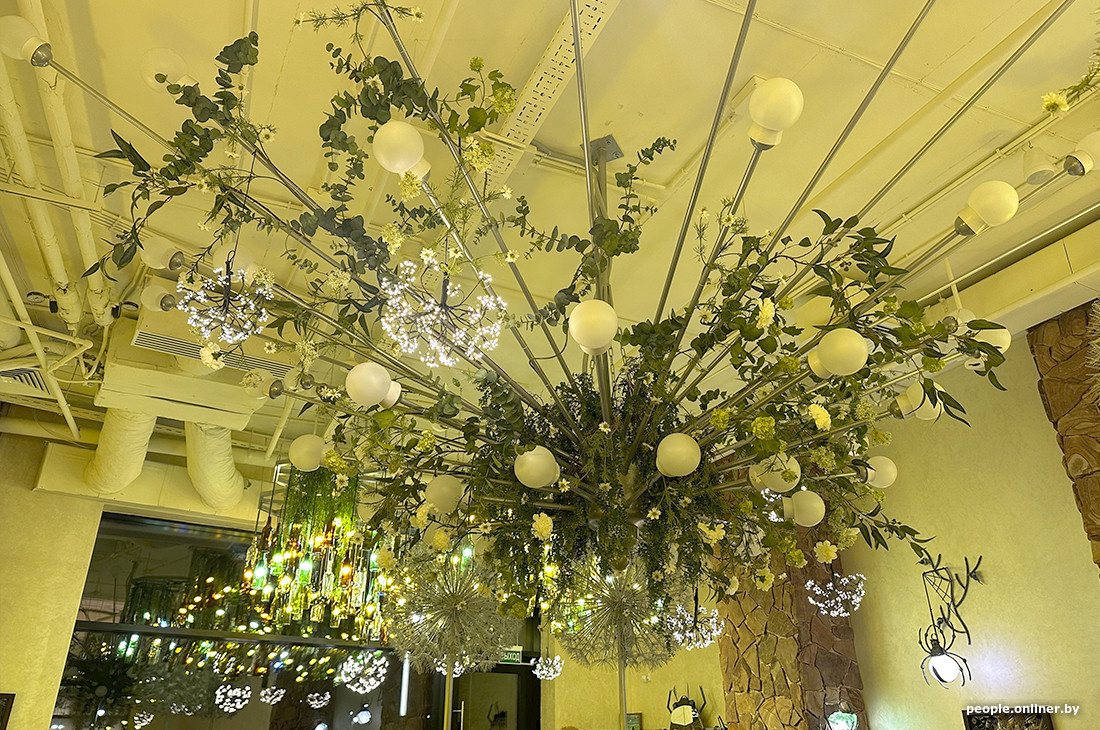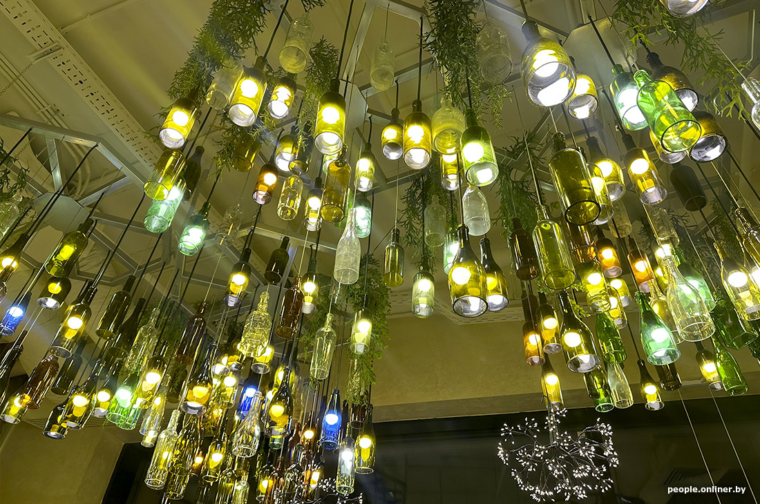 Заходим в кофейню, и глаз первым делом цепляется за оригинальный интерьер. Рядом со столиками стоят гигантские одуванчики, лежат огромные стеклянные камни, с потолка свисают люстры-бутылки. Смотрится дизайн свежо и симпатично.