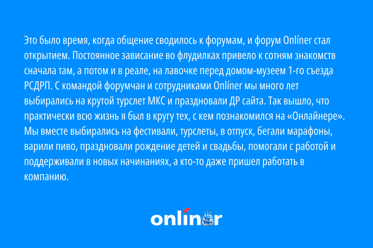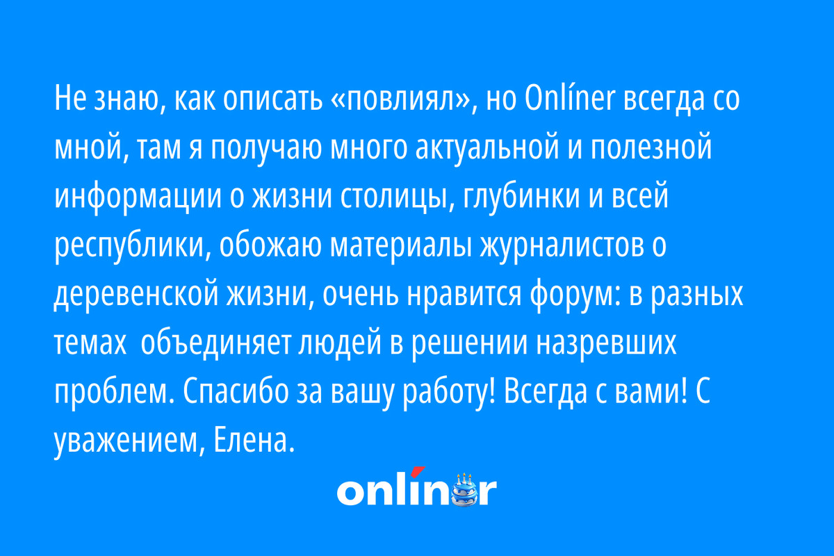 Незадолго до дня рождения сайта мы задумались об эффекте бабочки. Сколько раз за 24 года работы происходил тот самый взмах крыльев, который случайно менял чью-то судьбу? Размышляли недолго, с вопросом «Как Onlíner повлиял на вашу жизнь?» обратились к вам самим — читателям сайта. И оказалось, что такие истории действительно есть, причем разброс важных событий внушительный: от кардинальной смены работы до знакомства с будущей женой. За эти годы мы написали километры текстов — сейчас слово за вами, дорогие читатели.