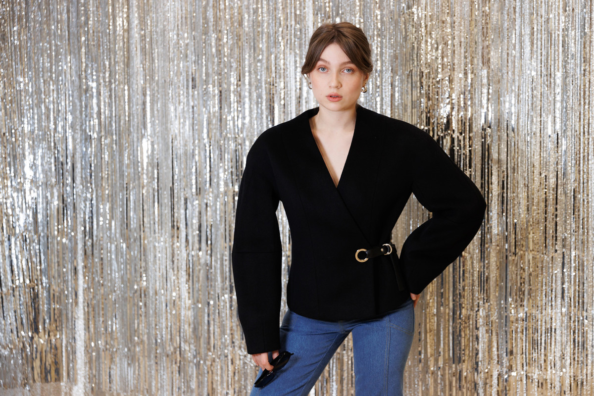 Подобные гипертрофированные вещи лучше всего балансировать более узкими. Поэтому тандем О-образного полупальто и джинсов классической посадки получился очень удачным.