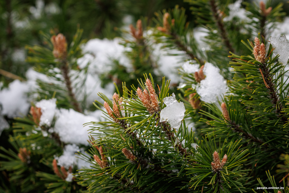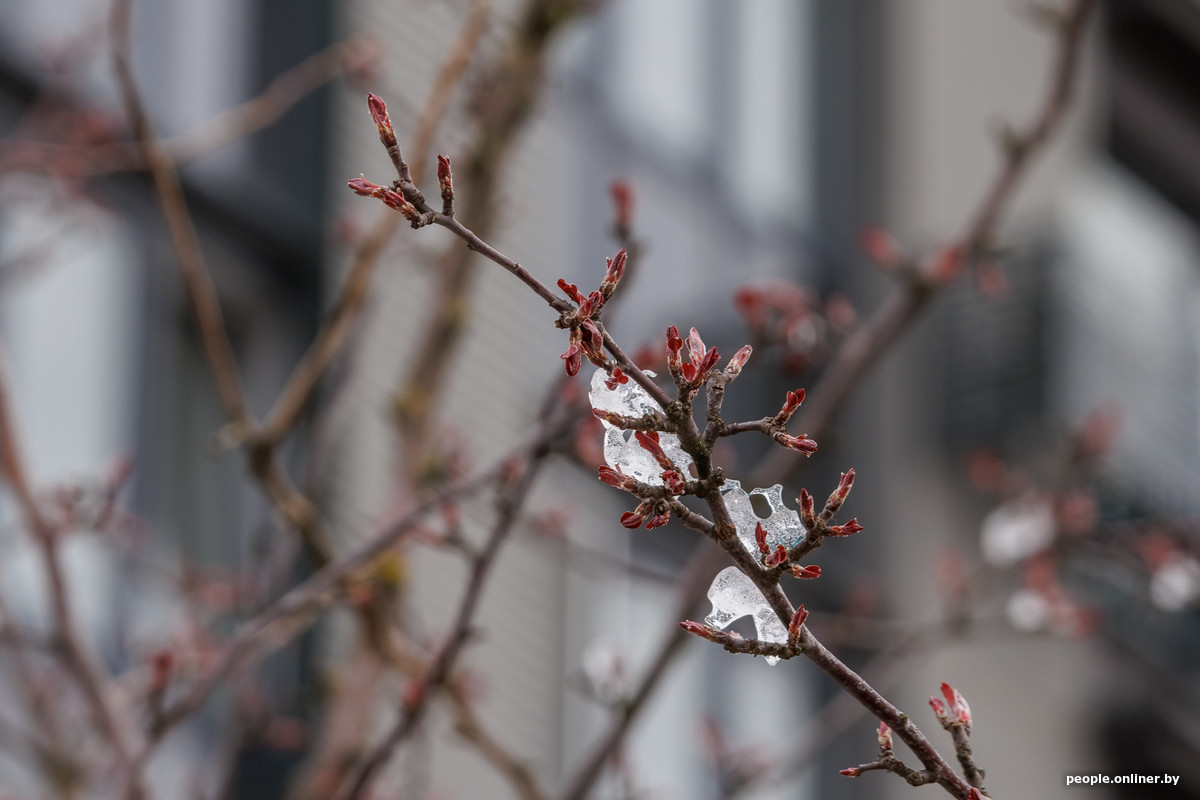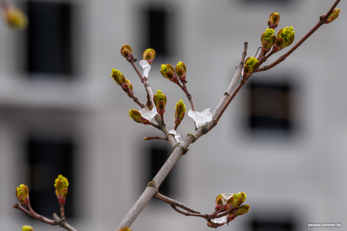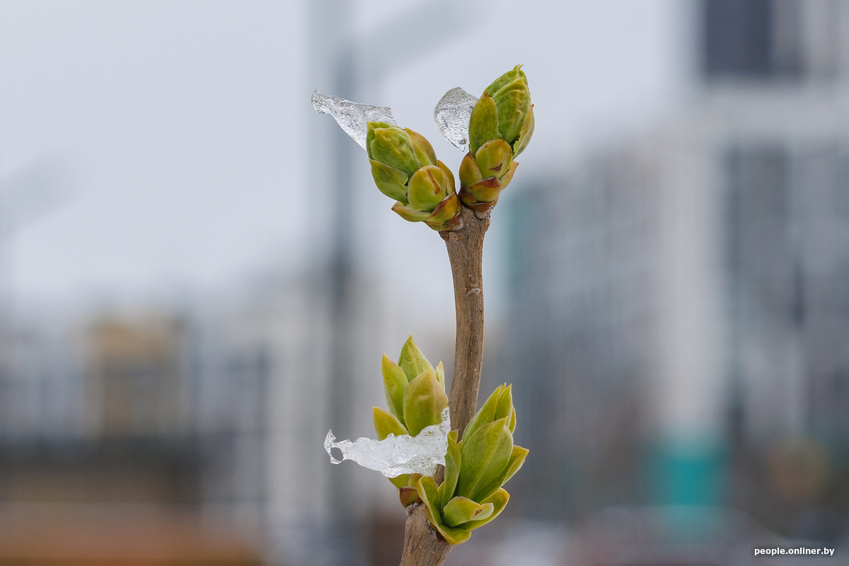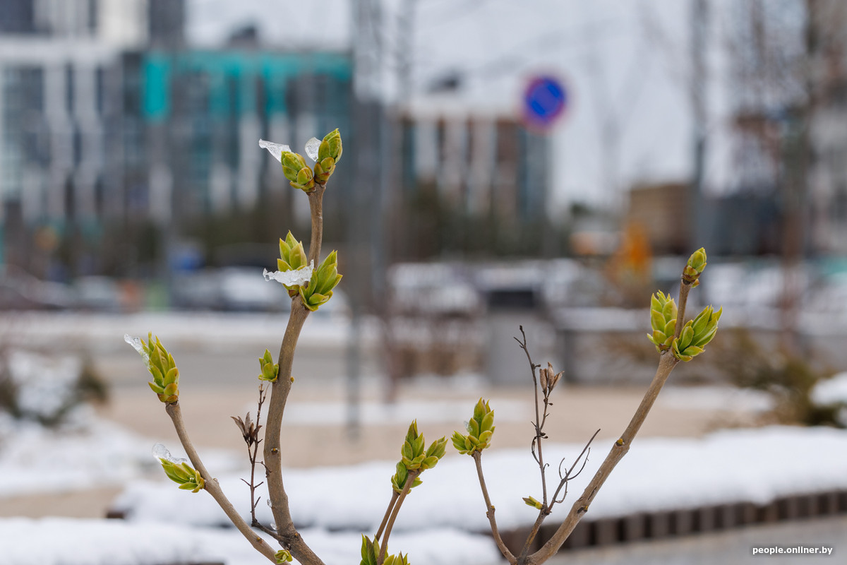Наш фотограф все-таки выбрался из зимней столицы и привез свежие кадры. Снег в городе шел почти весь день, но на дорогах и тротуарах он надолго не задержался: асфальт теплый, так что снежное покрывало превращается в воду практически на глазах. А вот на клумбах, крышах и деревьях белый пушистый все еще лежит, создавая неестественный по контрасту с распускающейся природой пейзаж. Ростки цветов, кустов и молодых деревьев покрыты льдинками.