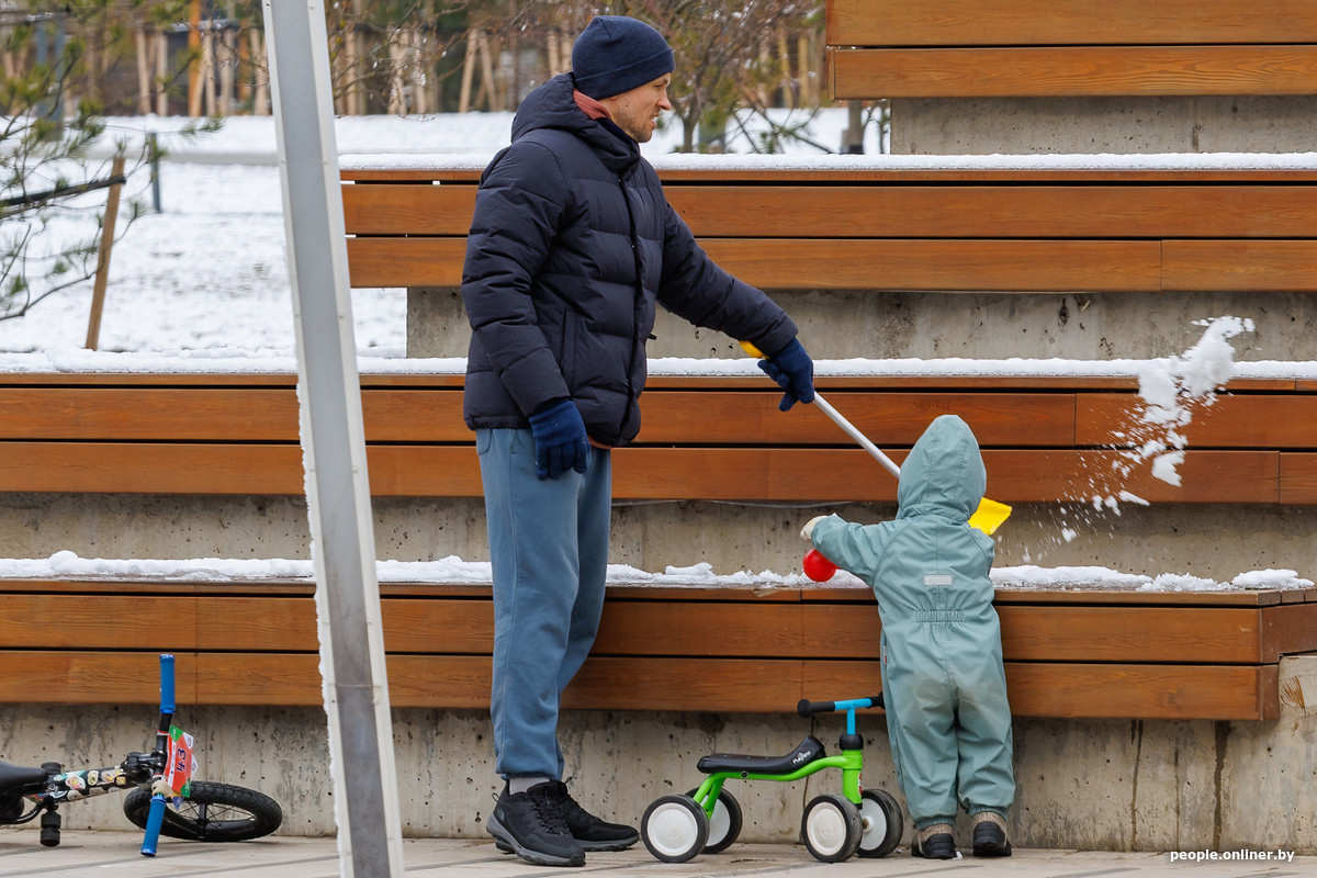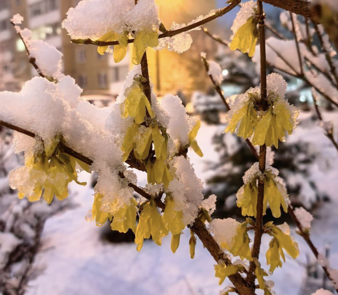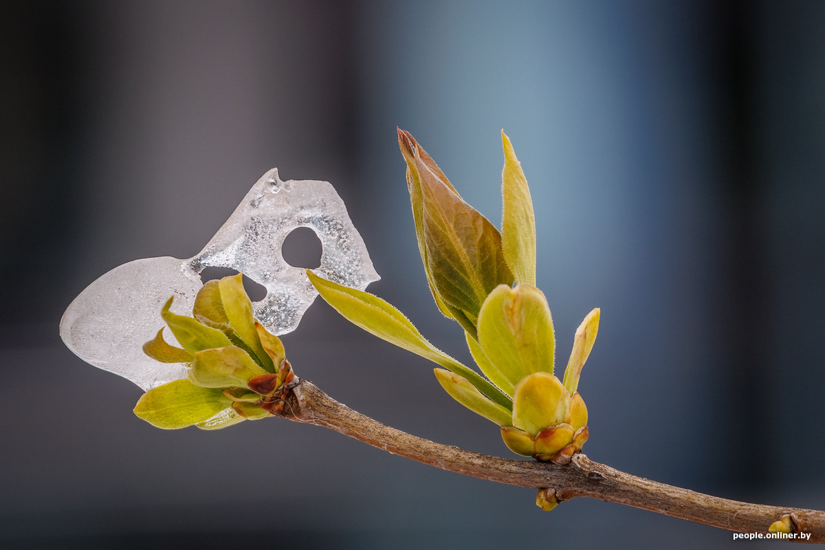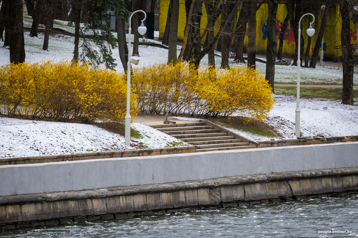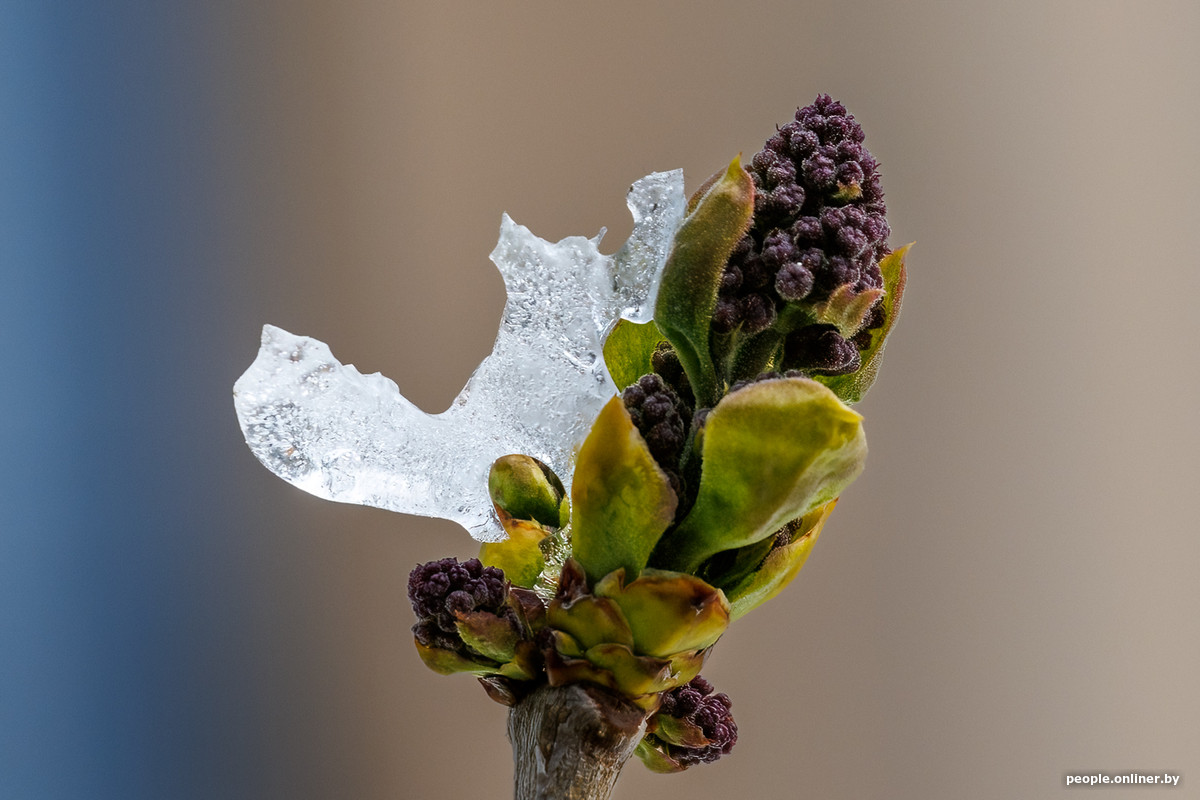 Наш фотограф все-таки выбрался из зимней столицы и привез свежие кадры. Снег в городе шел почти весь день, но на дорогах и тротуарах он надолго не задержался: асфальт теплый, так что снежное покрывало превращается в воду практически на глазах. А вот на клумбах, крышах и деревьях белый пушистый все еще лежит, создавая неестественный по контрасту с распускающейся природой пейзаж. Ростки цветов, кустов и молодых деревьев покрыты льдинками.