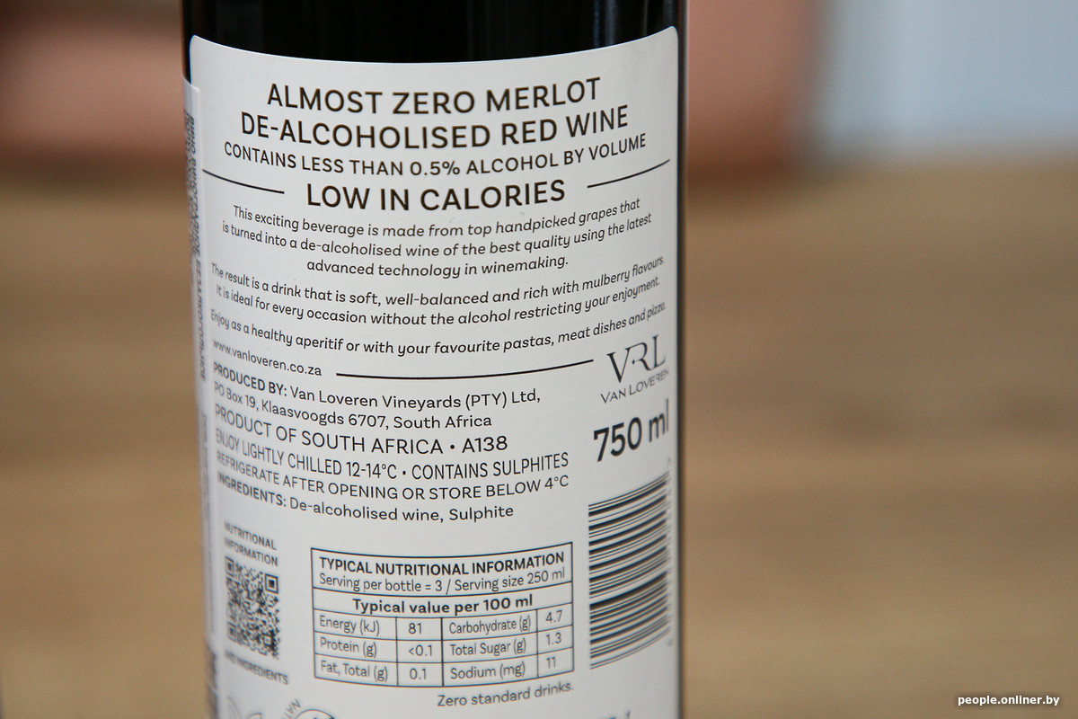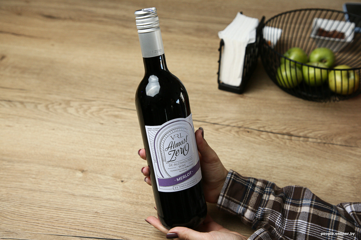 Напоследок закидываем в корзину бутылочку безалкогольного красного мерло из Южной Африки. Сейчас в Беларуси можно без труда найти несколько десятков видов вина с содержанием спирта меньше 0,5% — мы сориентировались лишь на незнакомую для себя марку и приемлемый ценник в 26 рублей.