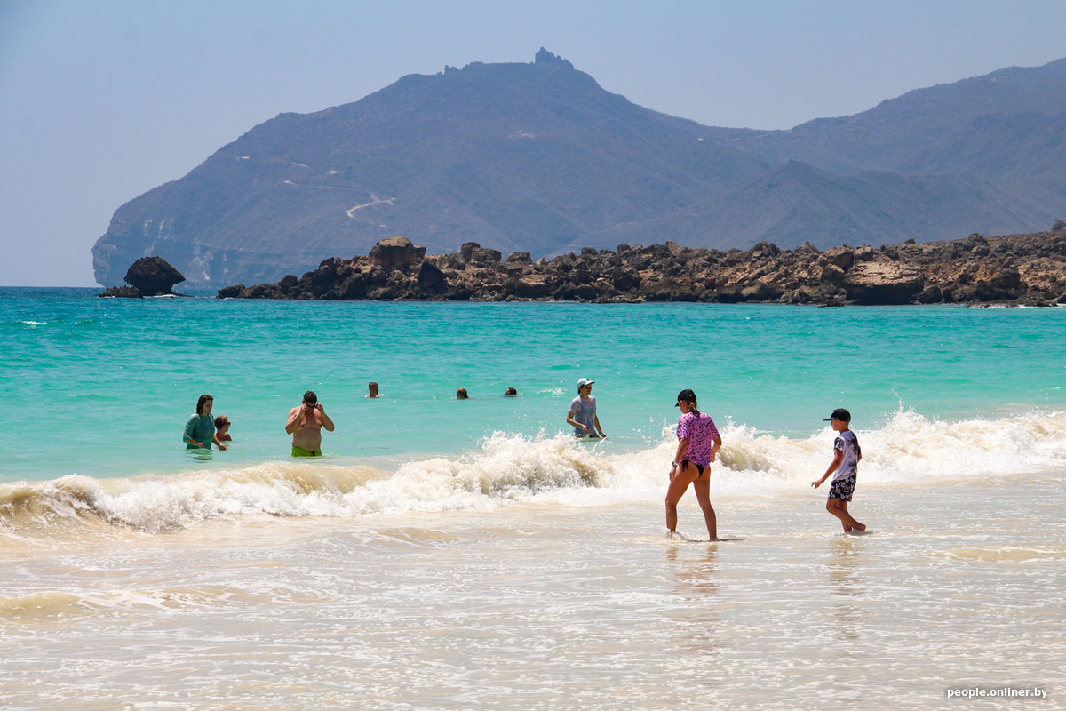 Пляж дикий, поэтому все необходимое организаторы экскурсии привозят с собой. На двух туристов — один зонтик, что вызывает массовый вздох облегчения у всех, кто успел познакомиться с оманским солнцем поближе. Чуть позже накрывают стол с легким перекусом: фрукты, финики, чай.