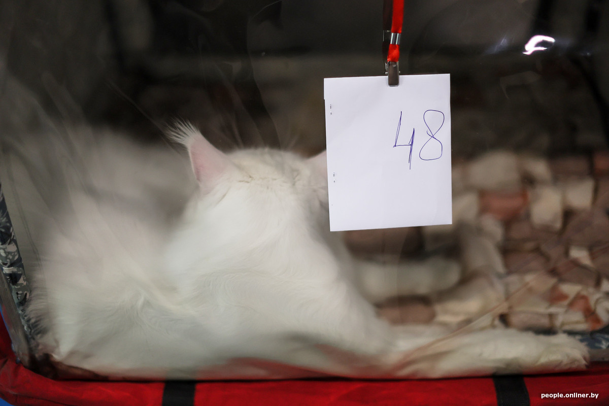 Организация выставки вполне привычная: ряды столов, накрытые клетки, участники с табличками, подушками и декоративными игрушками. Многие животные явно устали от внимания и предпочитают спать. Некоторые — наоборот, тянут лапы к каждому прохожему.