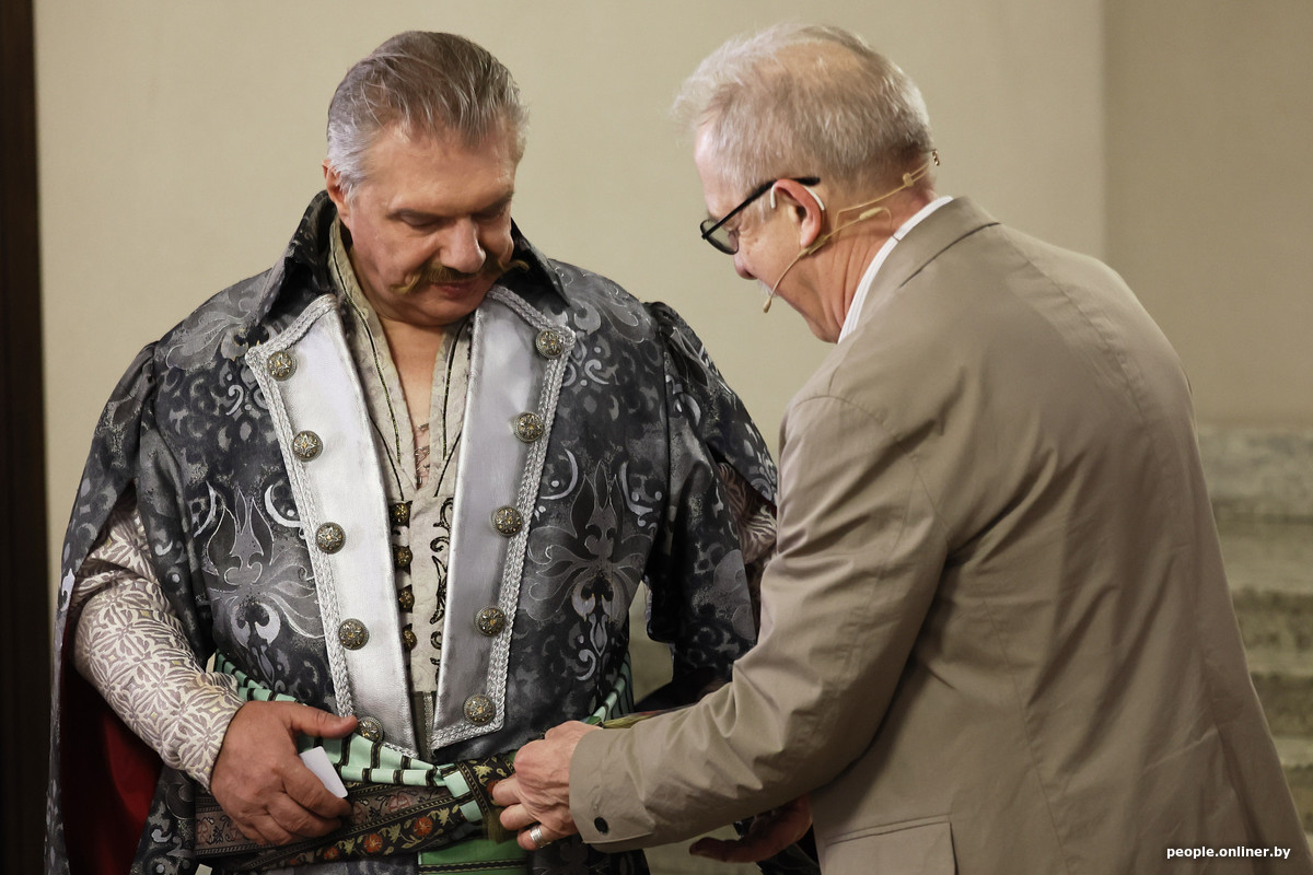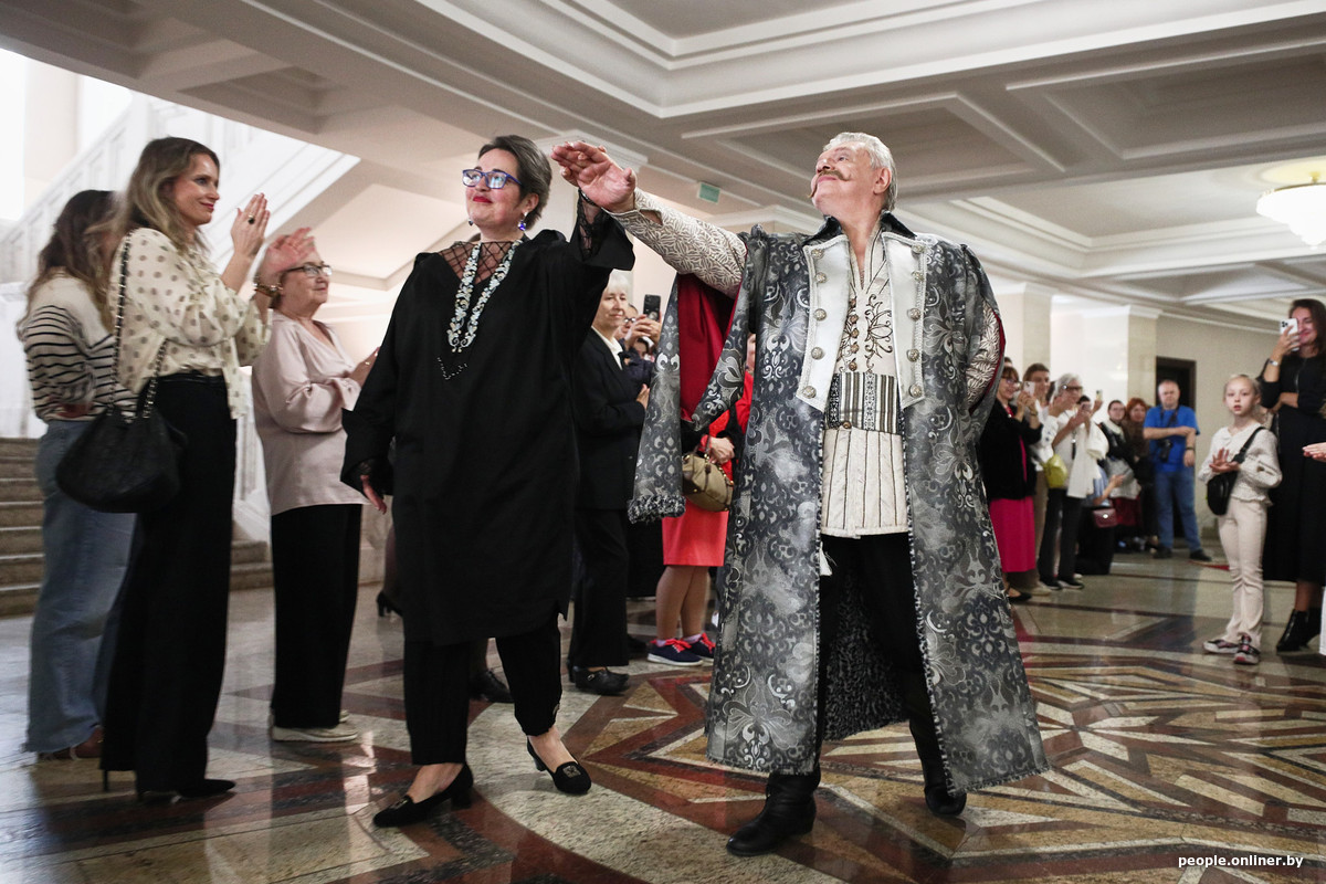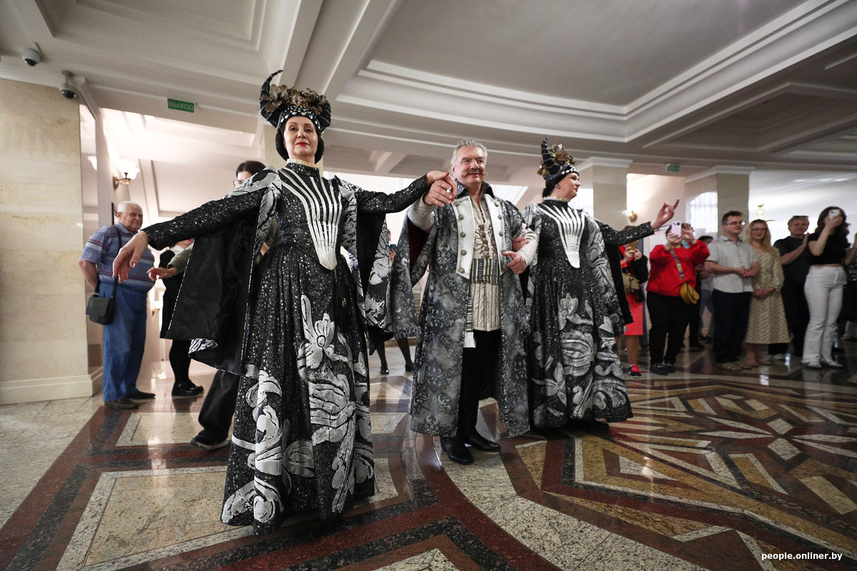 Каб тэма моды была раскрыта поўнасцю, а нашы традыцыйныя ўзоры зайгралі на ўсю моц, зоркі Вялікага прынялі ўдзел у дэфіле. На кожным артысце — строі з нацыянальных спектакляў. Толькі паглядзіце на гэтыя ўзоры, колеры і дэталі!