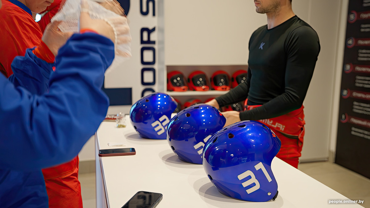 Каждому выдают экипировку по размеру: комбинезон, шлем, очки и обувь. Шлем можно выбрать и закрытый, но инструктор настоятельно рекомендует открытый — «для тех самых особых ощущений». И, видимо, тех самых легендарных снимков с раздувающимися щеками. Под комбинезоном стоит оставить комфортную одежду, все украшения нужно снять, длинные волосы заплести в косичку и спрятать под шлем.