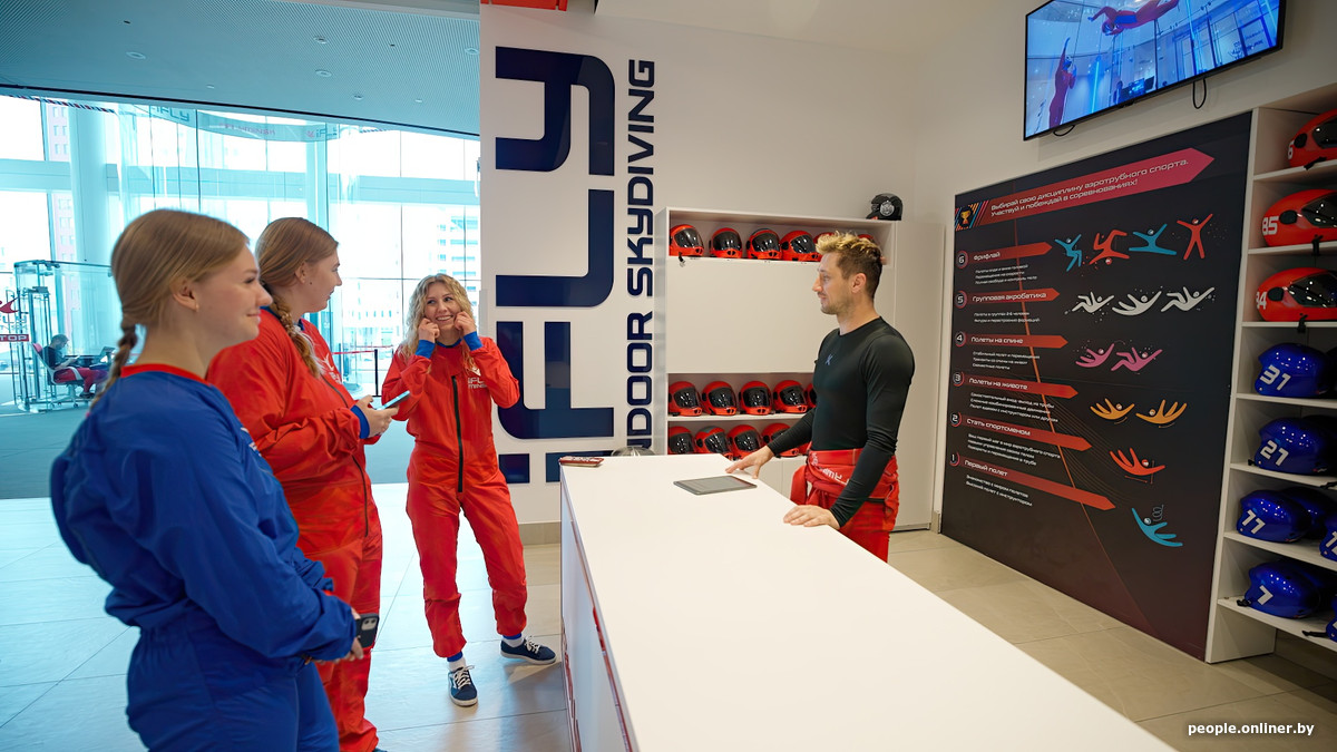 — Сейчас мы наденем беруши и больше не сможем общаться словами: в трубе очень шумно. Поэтому запоминаем знаки. Первый полет — будем внизу на уровне примерно метра от земли. Второй — полетим наверх. Вам для этого ничего делать не нужно, помогать себе тоже не нужно, я все сделаю сам. Все понятно? Тогда погнали! Ощущений у вас будет выше крыши — в прямом смысле, — бодрит притихших и только испуганно переглядывающихся нас Антон.