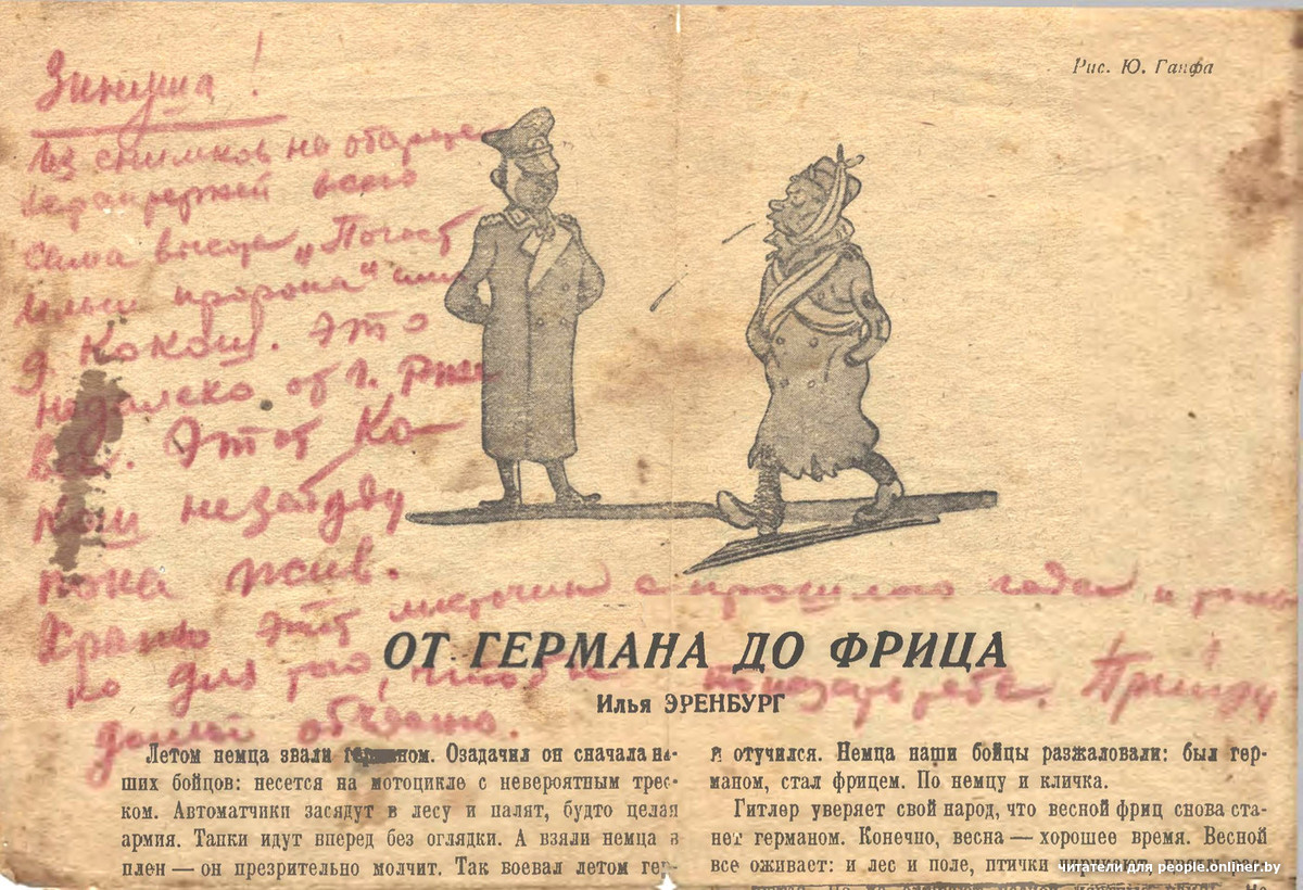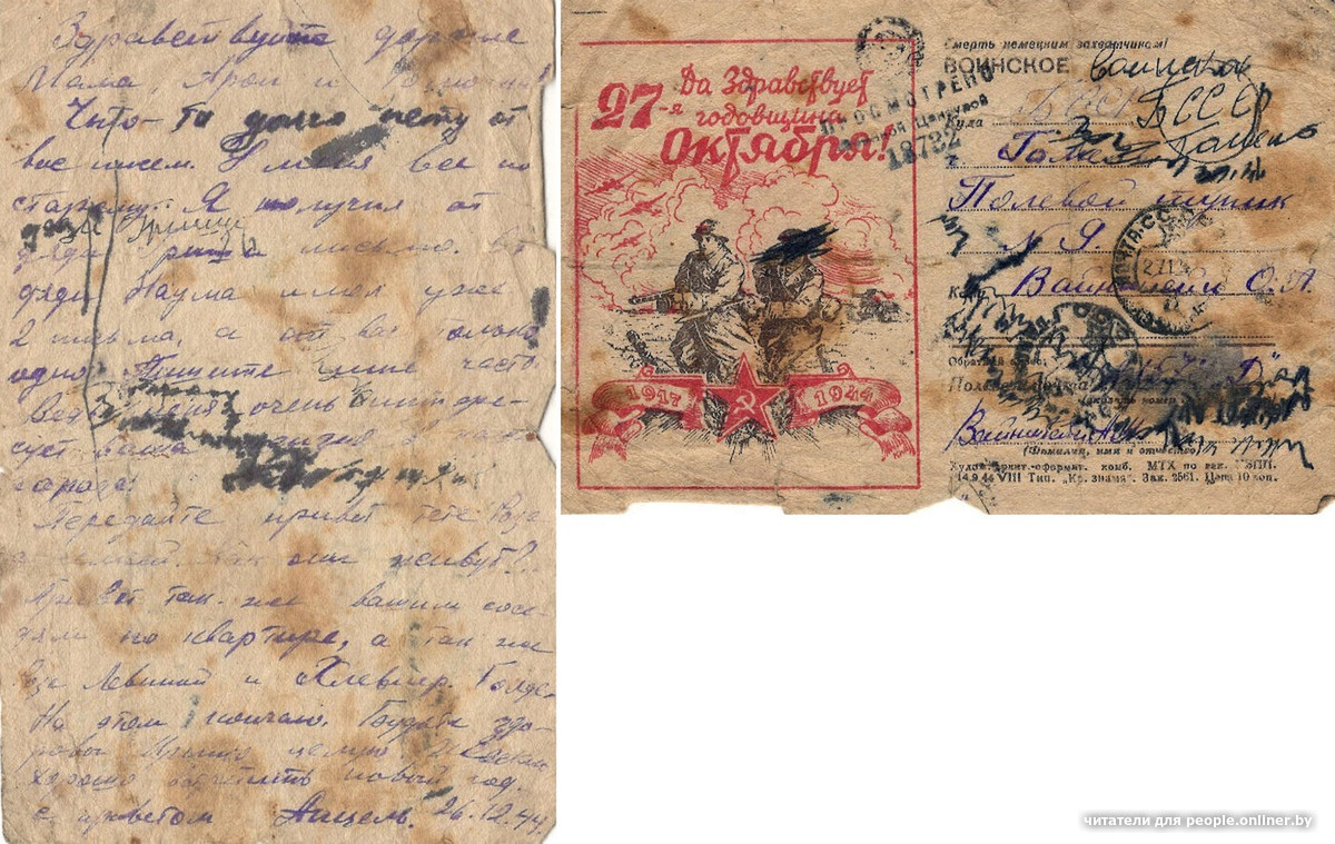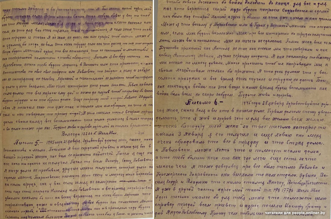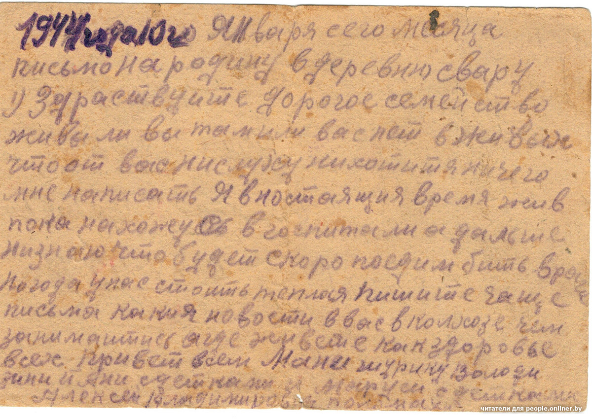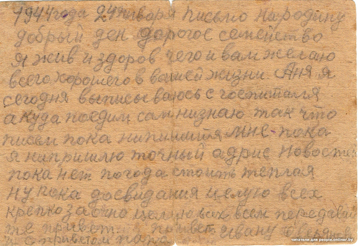 «1944 года 24 января, письмо на родину. Добрый день, дорогое семейство. Я жив и здоров, чего и вам желаю. Всего хорошего в вашей жизни. Аня, я сегодня выписываюсь с госпиталя, а куда поедим — сам низнаю. Так что писем пока нипишитя мне — пока я нипришлю точны адрес».