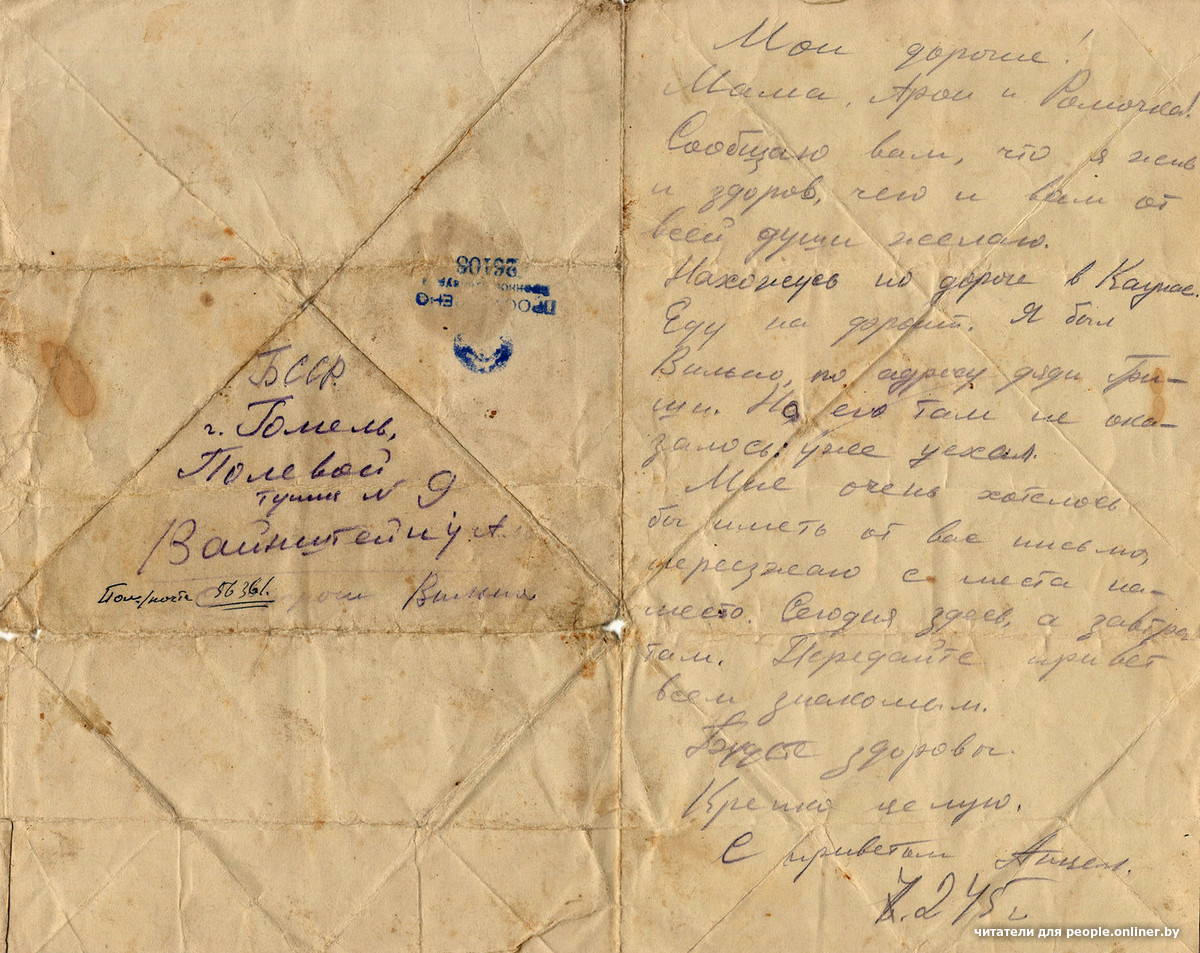 «Мои дорогие! Мама, Арон и Ромочка! Сообщаю вам, что я жив и здоров, чего и вам желаю! Нахожусь по дороге в Каунас. Еду на фронт. Я был в Вильно, по адресу дяди Гриши. Но его там не оказалось: уже уехал. Мне очень хотелось бы иметь от вас письма, переезжаю с места на место. Сегодня здесь, а завтра там».