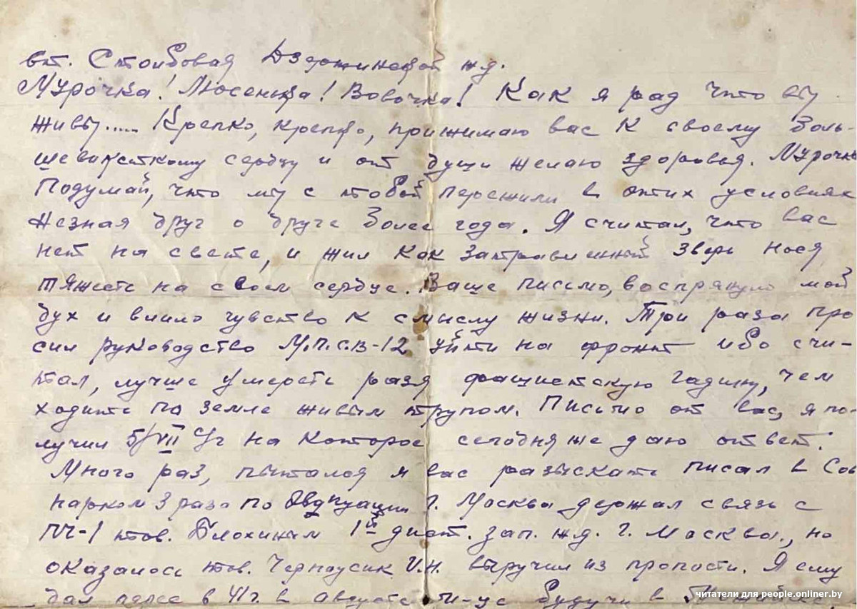 «Мурочка! Люсенька! Вовочка! Как я рад, что вы живы… Крепко, крепко, крепко прижимаю вас к своему большевистскому сердцу и от души желаю здоровья. Мурочка, подумаю, что мы с тобой пережили в этих условиях не зная друг о друге больше года. Я считал, что вас нет на свете и жил как затравленный зверь, нося тяжесть на своем сердце. Ваше письмо воспрянуло мой дух и влило чувство к смыслу жизни. Три раза просил руководство М.П.С.В-12 уйти на фронт ибо считал, лучше умереть разя фашистскую гадину, чем ходить по земле живым трупом (…) Много раз, пытался я вас разыскать, писал в Совнарком 3 раза по эвакуации».