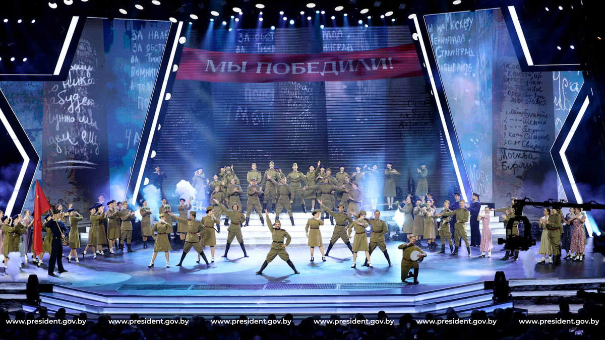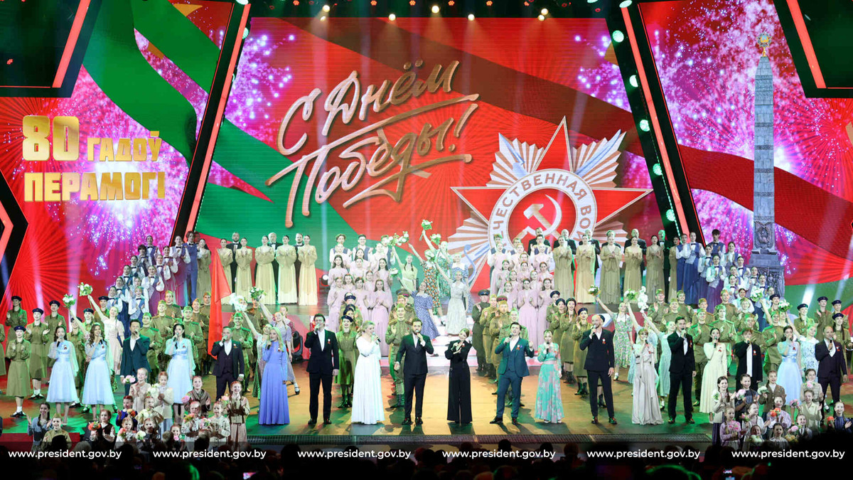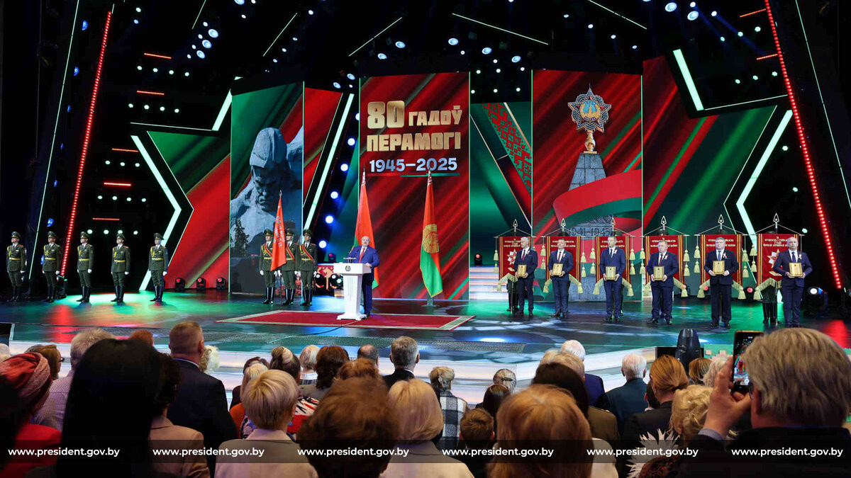 Лукашенко напомнил, что Беларусь героически сражалась на фронте, в партизанских отрядах и подполье. Враг не чувствовал себя хозяином ни дня: ему противостояли не только люди, но и сама земля — леса, болота, руины. Он поблагодарил все советские народы за вклад в Победу и отметил, что нынешний юбилей проходит в сложное время — на фоне нового передела мира.