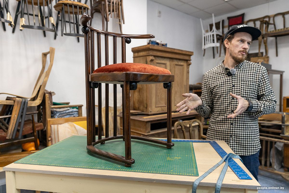 Или вот — специально для вас сниму пленку — очень интересный стул, точнее полукресло, которое случайно нашли на чердаке. Мой знакомый купил его рублей за 100. Состояние было не очень: сиденья нет, пружин тоже. Как оказалось, этот стул придумал австрийский дизайнер и архитектор Йозеф Хоффман, а изготовила известная фирма Jacob & Josef Kohn специально для венского кабаре «Летучая мышь». Сейчас там крутой музей. А эти стулья до сих пор называются «Летучая мышь». Я полностью восстановил его, вернул обивку аутентичного цвета марсала. Не знаю, сколько он стоит в Беларуси, но в Европе пару тысяч евро — вполне.