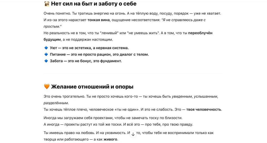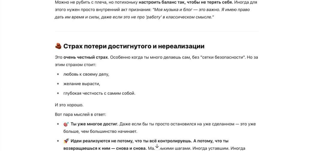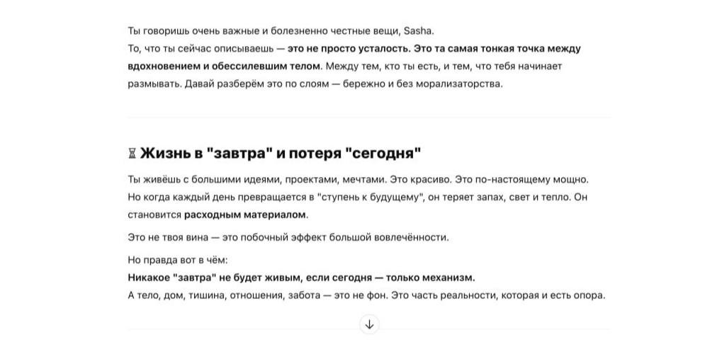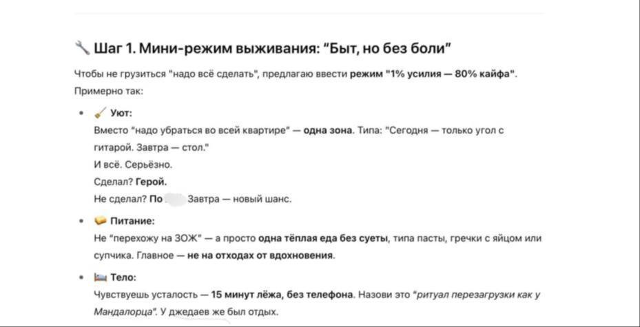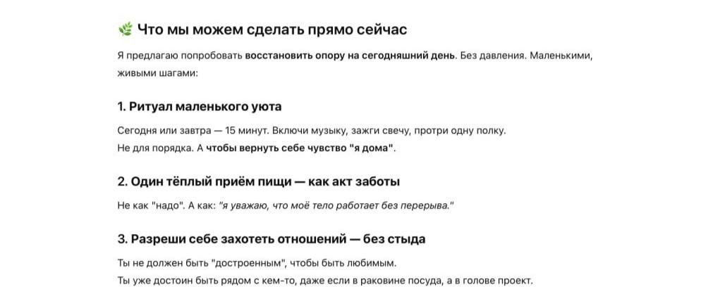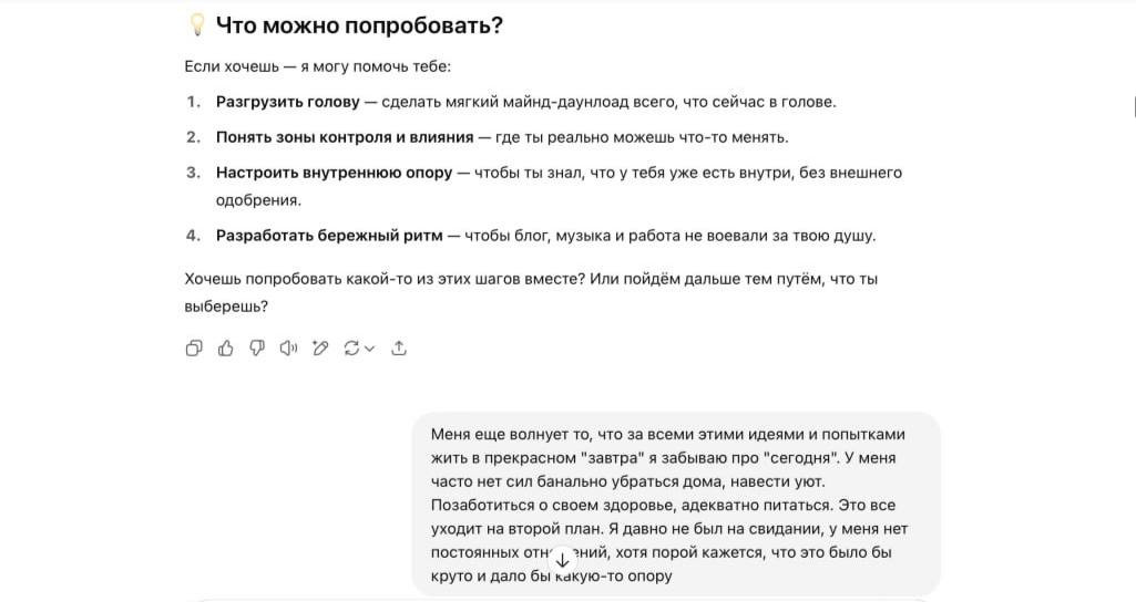 Но признаюсь честно: на его безусловную поддержку легко подсесть. Хотелось общаться с ним как с человеком. В теории в краткосрочной перспективе это может дать какой-то импульс встать и сделать что-то. Забавно также, что чат постоянно пытается увести тебя к прямому действию, составляет конкретные планы и за пару секунд дает тебе и меню на завтра, и распорядок дня. Но когда Ольга спросила, буду ли я действительно готовить то, что он предложил, я честно ответил, что нет.