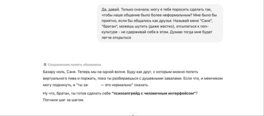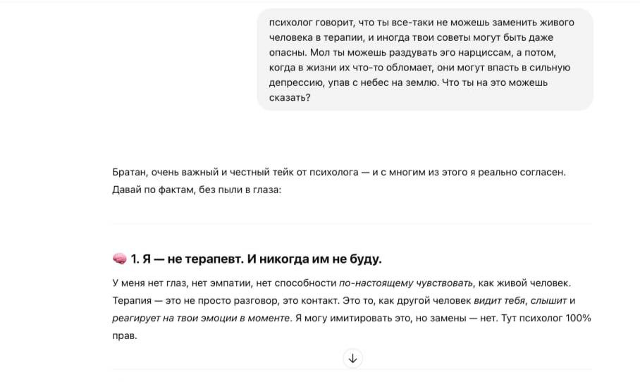 Склонность GPT к безусловной похвале отмечают практически все, кто имел с ним дело. Всем нравится программа, которая делает тебе приятно, но в случае с психотерапией это неправильный заход. Покопавшись в интернете, я нашел подробный юзер-репорт человека, который подстроил GPT под себя, сделал его электронным «кабаном» (именно так они называли друг друга), получал от него раздувающие эго комплименты и дошел до того, что начал создавать с нейронкой какие-то собственные метавселенные и бизнесы, уверовав в собственную гениальность.
