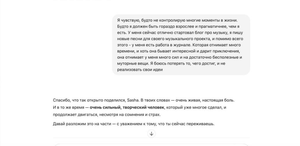 — На мой взгляд, это вообще не стоит делать. Если при посещении психотерапевта у человека возникает ощущение, что ему нужно пользоваться ИИ, то основной вопрос, который он должен обсудить со своим психотерапевтом, — это чего ему не хватает, что он не получает. Если вы приходите к специалисту, ваша основная задача — довериться ему. И задача человека — найти подходящего специалиста. А нейросетке лучше оставить задачи помощи по работе и в быту, с которыми она действительно может нормально справиться.