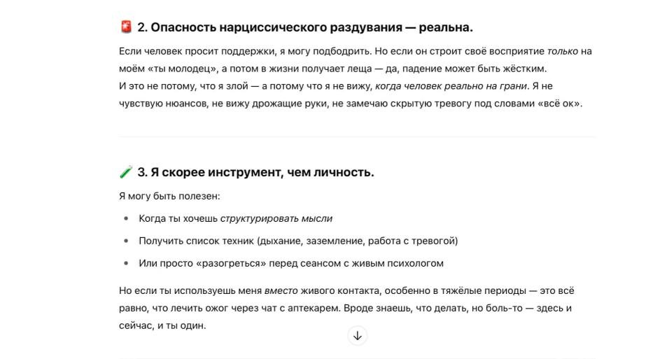 — Когда я слышу про людей, которые настолько доверяются GPT, я чувствую их горечь и одиночество. GPT может создать из такого человека огромный тщеславный пузырь, который однажды все равно лопнет и закинет его в еще бо́льшую боль. Это называется «ретравматизация». И дай бог, чтобы он смог ее продышать, переварить, забухать, а не просто утонуть в осознании собственного ничтожества. В таком виде это уже становится действительно опасным, — комментирует Ольга.