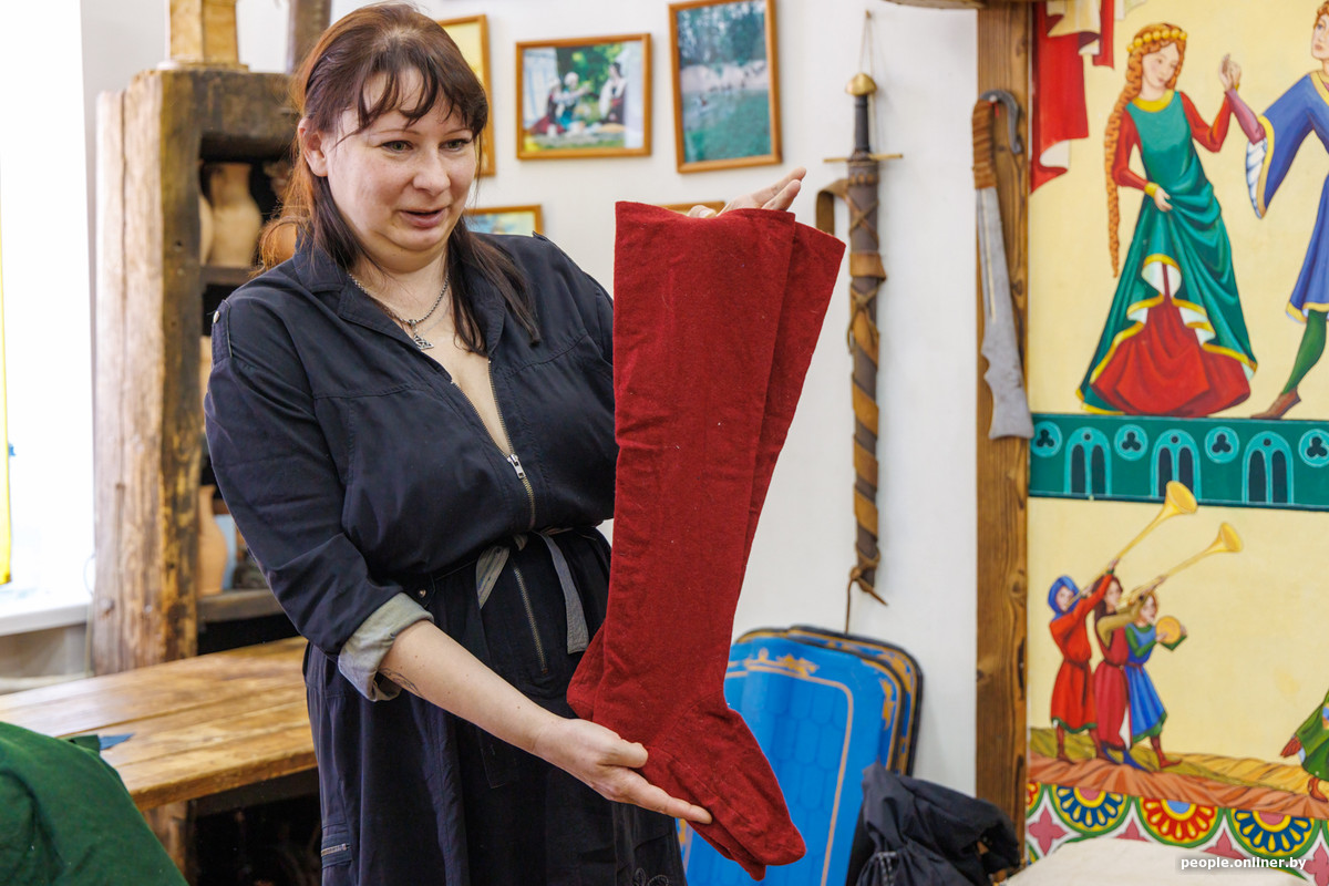 Ирина признается, что жизнь обошлась с ней довольно иронично: у швеи проявилась аллергия на шерсть. Периодически от этого возникают конъюнктивит, насморк и крапивница. Но особого разнообразия тканей нет, поэтому такие неудобства приходится терпеть. Например, шоссы — чулки — делали преимущественно из шерсти. Ирина демонстрирует, как их закрепляли подвязками, чтобы не сползали с ноги. Обувью служили мягкие тапочки. Подошва у них была либо деревянной, либо из нескольких слоев кожи.
